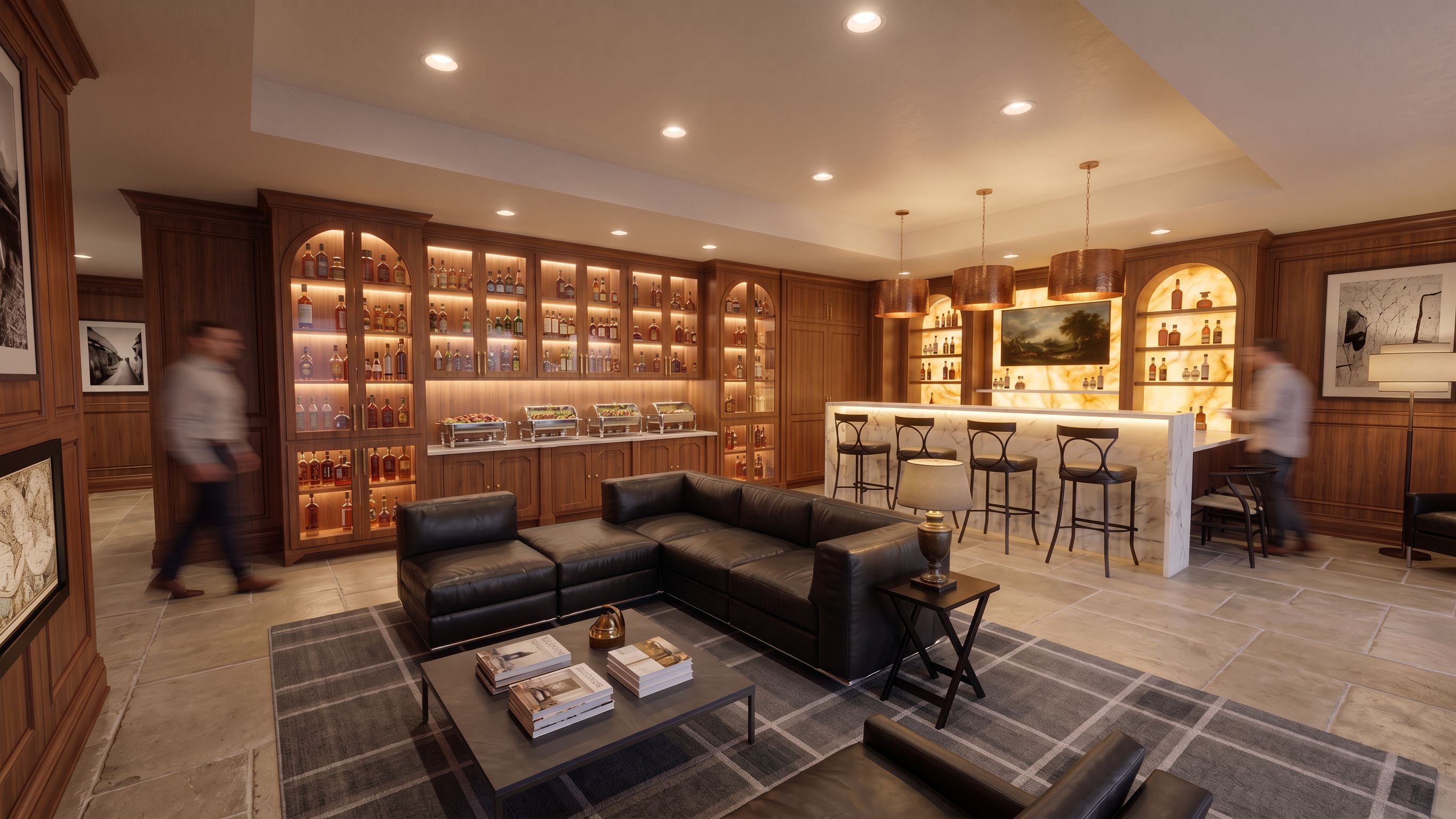 No rececessed ceiling. Flooring to be frecnh limestone. Make ceiling flat with down lighting. Show catering trays on counter under cabinets in background. underlight high bar counter counter. change pendants to drums of copper. Place flat screen on wall above fire place. Insert a picture on TV behind bar. Place art on wall next to bar., keep exact camera angle