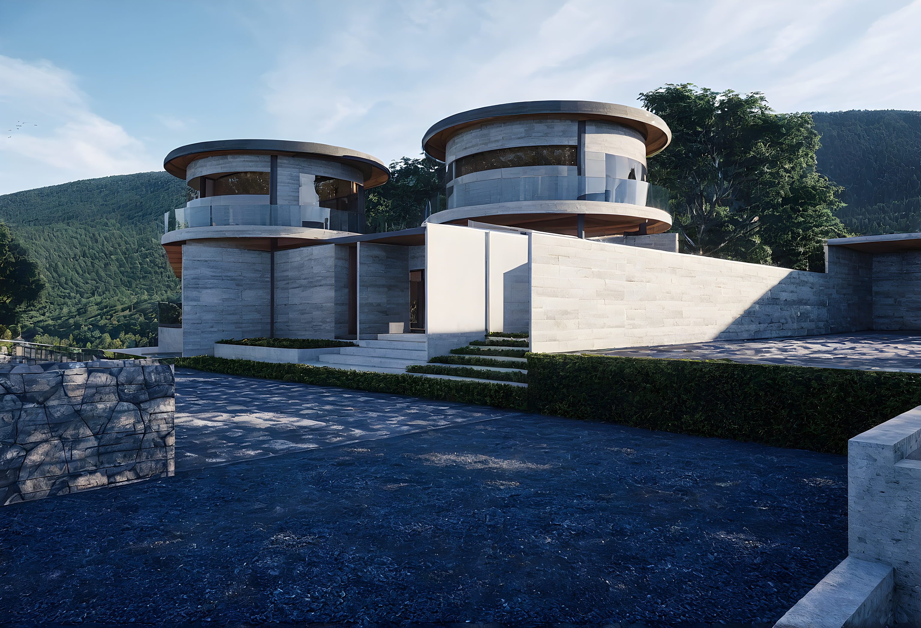 Promptthere are forest mountain background luxury style make this pic warmer render realistic render same color and material only the roof is deep blue color make light very shine just like original