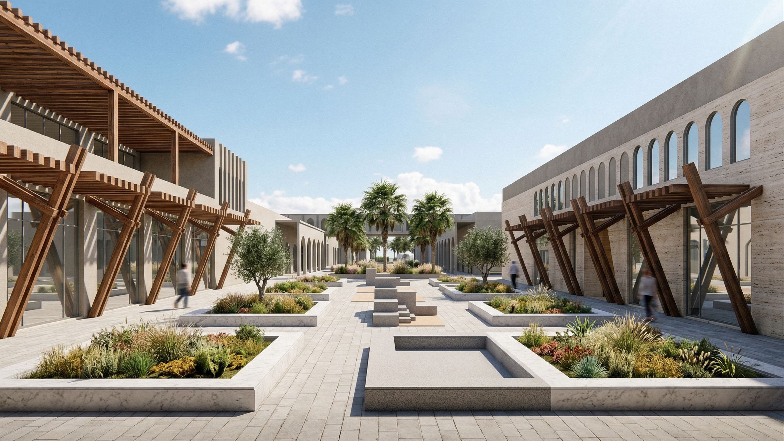 PromptUltra-realistic architectural render of the provided commercial marketplace design, preserving the exact geometry and layout without any modifications.