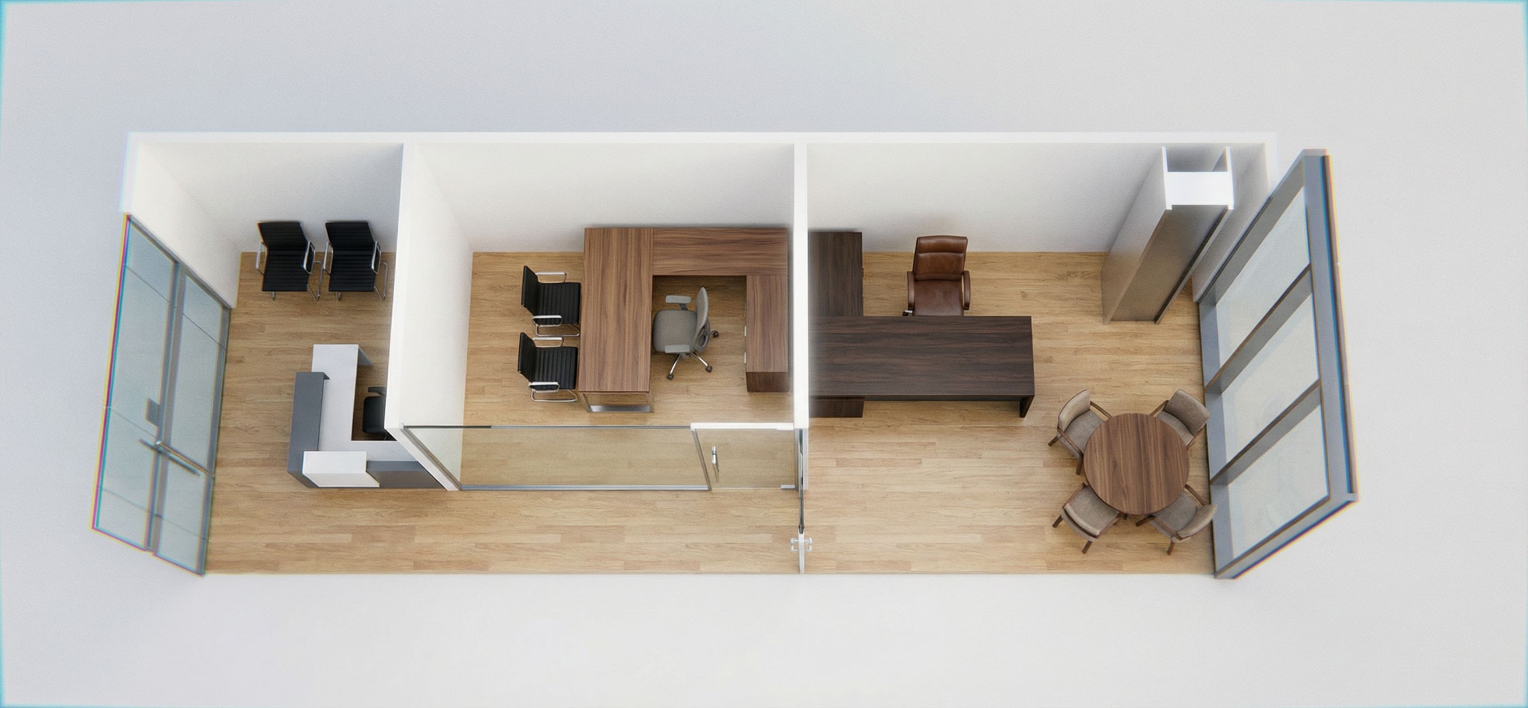 PromptUse the uploaded plan image strictly as locked base geometry reference. Preserve exact room dimensions: Reception: 2.50 m Office 1: 3.58 m Office 2 (executive): 4.25 m Maintain total width 3.02 m including 0.90 m corridor. Do not modify proportions. Do not resize rooms. Do not move walls. Construction system must remain: Transverse partitions are 10 cm drywall. Longitudinal partitions (parallel to corridor) are tempered glass with aluminum frames. Office 1 has longitudinal glass door. Office 2 door is transverse and cuts across the corridor. Corridor width must remain exactly 0.90 m. Only apply realistic materials and furniture. Furniture layout: Reception: desk + 2 waiting chairs. Office 1: 1.60 m executive desk + 2 guest chairs. Office 2 (executive): larger desk + small round meeting table. Camera: top-down orthographic aerial view. No dimension text. No overlays. No geometry reinterpretation. Treat geometry as CAD-locked plan. Zero geometry transformation. Strict dimensional fidelity required.