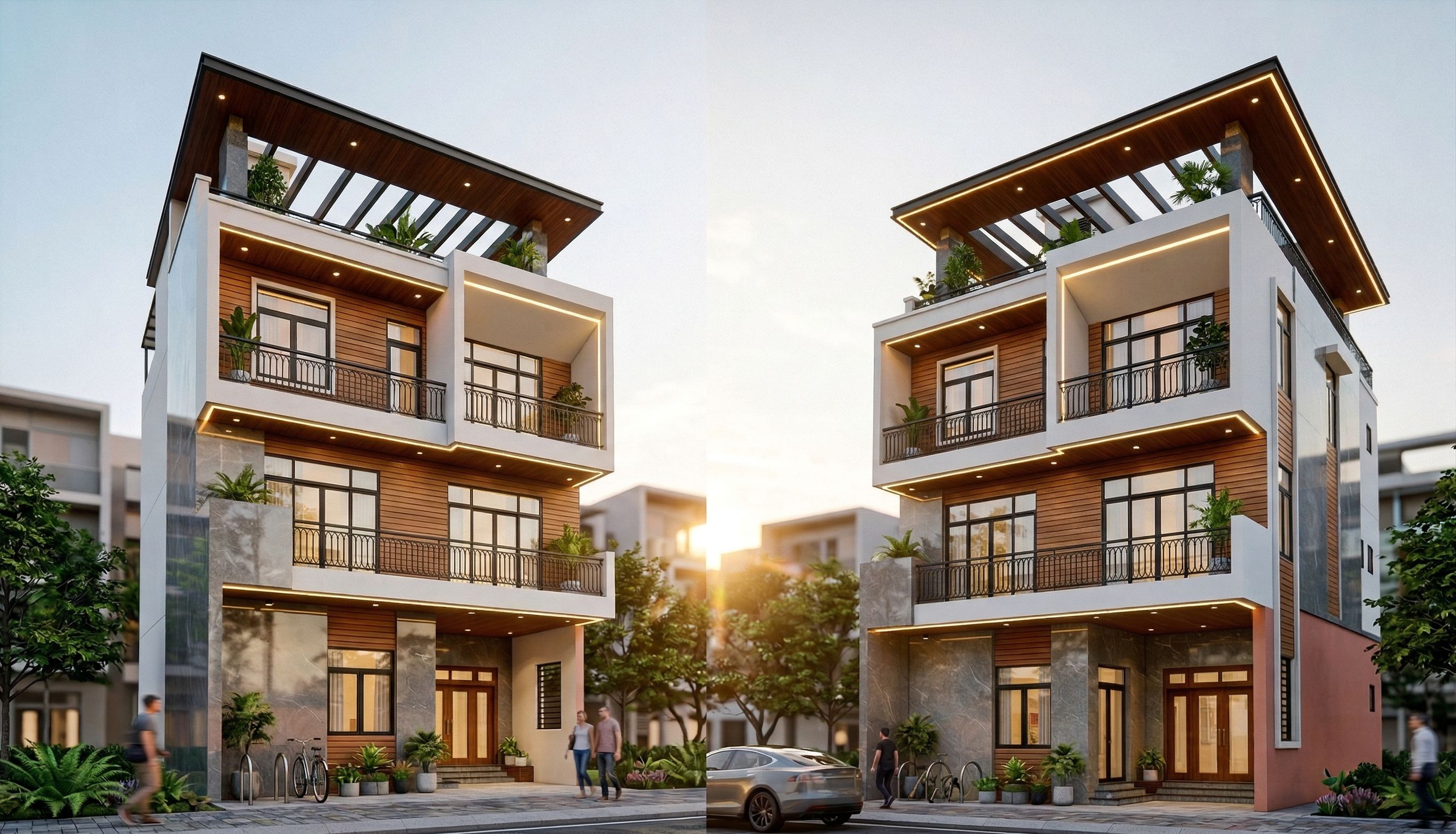 This photograph captures a modern three-story family home, harmoniously blending natural grey stone with subtle veins and a glossy surface, white paint, and horizontal wood cladding along the walls. The house features large glass windows and balconies with black-painted iron railings, adorned with small potted plants and people standing nearby. Several potted plants are placed on the terrace. The underside of the roof is clad in dark wood. The balconies are painted white, and LED lights run along the balconies and roof base, creating a modern and magnificent scene. The house is surrounded by lush greenery and urban elements, including tree-lined streets and neighboring buildings. The setting sun casts warm rays on the facade, creating inviting shadows. The original design has been preserved. Shot from a low angle, the lens emphasizes the height and architectural details, enhancing the visual depth of the scene., keep exact camera angle
