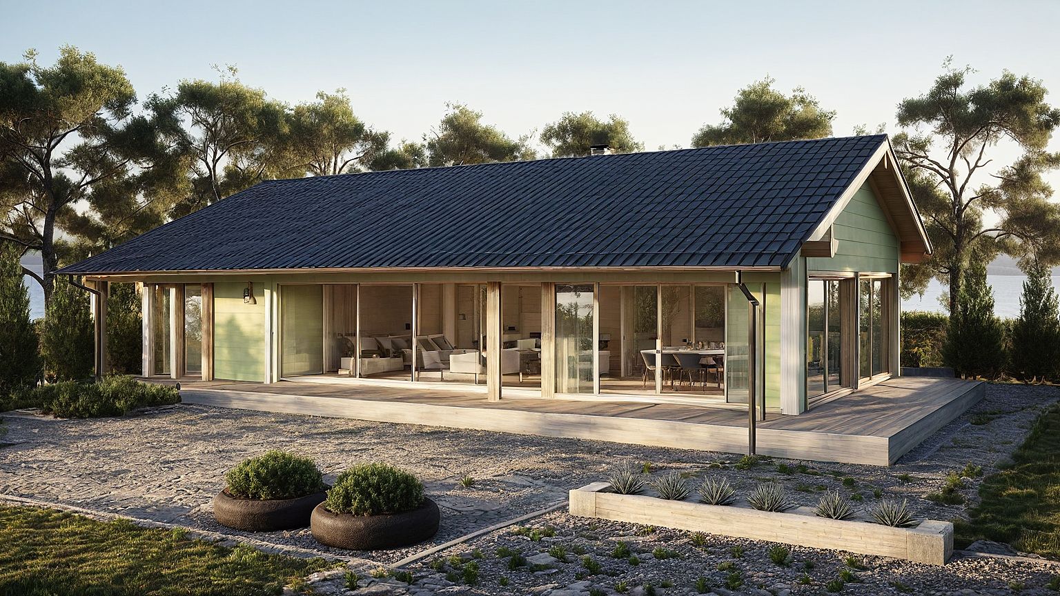 PromptA single-story Honka wooden house, transformed into a Mediterranean-inspired retreat. Keep the original structure and proportions, but adapt the exterior with light, pastel green wooden walls. Replace the dark deck with stone-paved or light wooden terrace flooring. Add green Mediterranean landscaping: rosemary, lavender, olive trees. The setting should reflect late afternoon golden sunlight, with a calm, coastal southern European atmosphere. Large glass sliding doors remain, allowing a seamless indoor-outdoor transition. A hint of rustic charm and natural textures, with soft shadows and warm tones throughout."