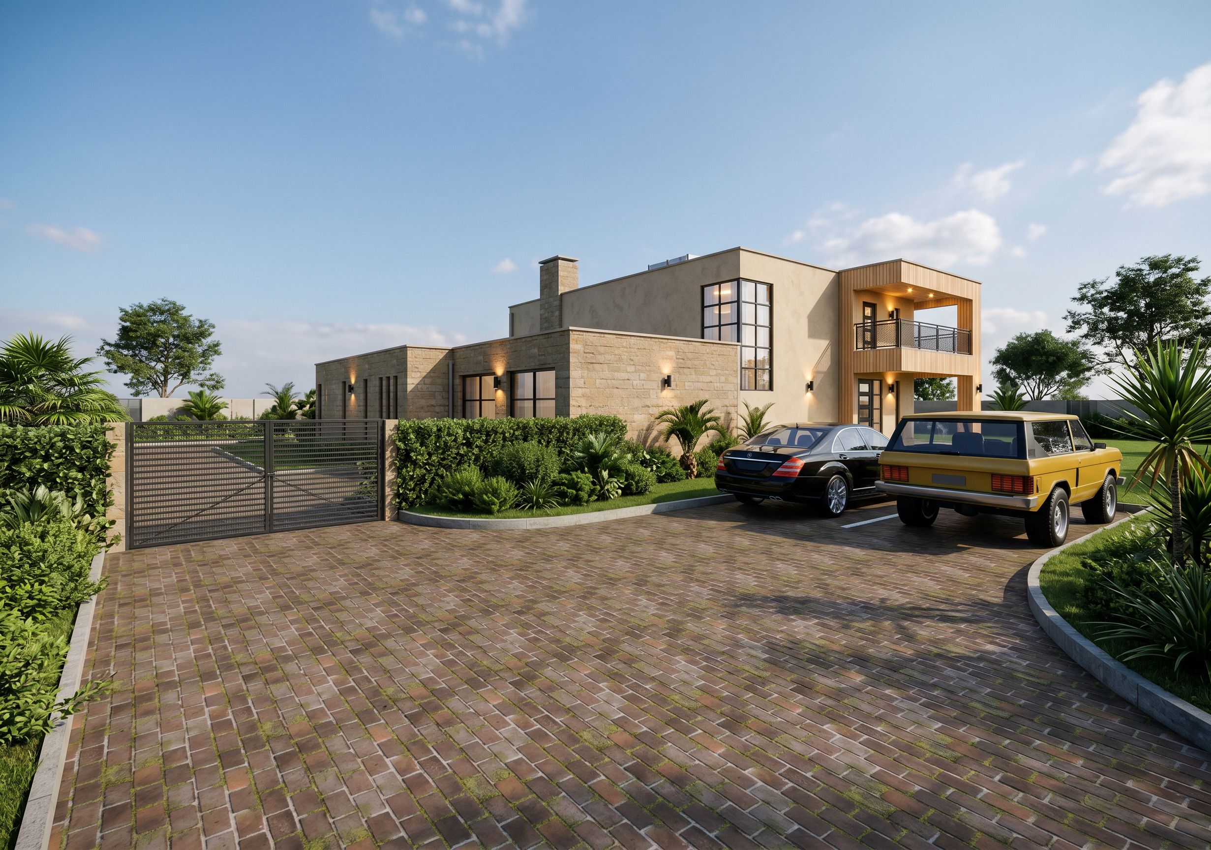 PromptCreate a daytime, ultra-photorealistic exterior architectural render based on the attached reference image, viewed from an eye-level street perspective with a subtle wide-angle lens. The design is a contemporary two-storey residence with textured warm beige plaster walls, light natural timber vertical cladding, and warm-toned stone cladding at the lower level. Black aluminium framed windows and doors with clear glass define the openings, while a flat-roofed upper level features a balcony with black metal and mesh railing. The cobble stone paved driveway appears clean and slightly weathered, leading to natural stone entrance steps. Two luxury cars are parked at the parking. Natural daylight fills the scene under a clear sky, with realistic sun direction casting soft, accurate shadows across walls, paving, and landscaping. Exterior wall lights and balcony soffit downlights are switched on, emitting a warm glow that contrasts subtly with the daylight, while interior lighting is faintly visible through the glazing for depth. Enhance the landscaping with lush green bushes and low shrubs placed around the footprint, complemented by neatly maintained lawn areas and a few taller ornamental plants near boundary walls. Vegetation should feel tropical, balanced, and well-scaled, with gentle leaf shadows adding realism. All materials should display high-resolution textures and subtle imperfections, with realistic glass reflections and accurate global illumination. The overall mood is calm, refined, and premium, suitable for high-end residential marketing, with no people visible and a clean, magazine-quality finish. Turn on interior lights and the two-way exterior wall lights. Keep the exact camera angle., keep exact camera angle
