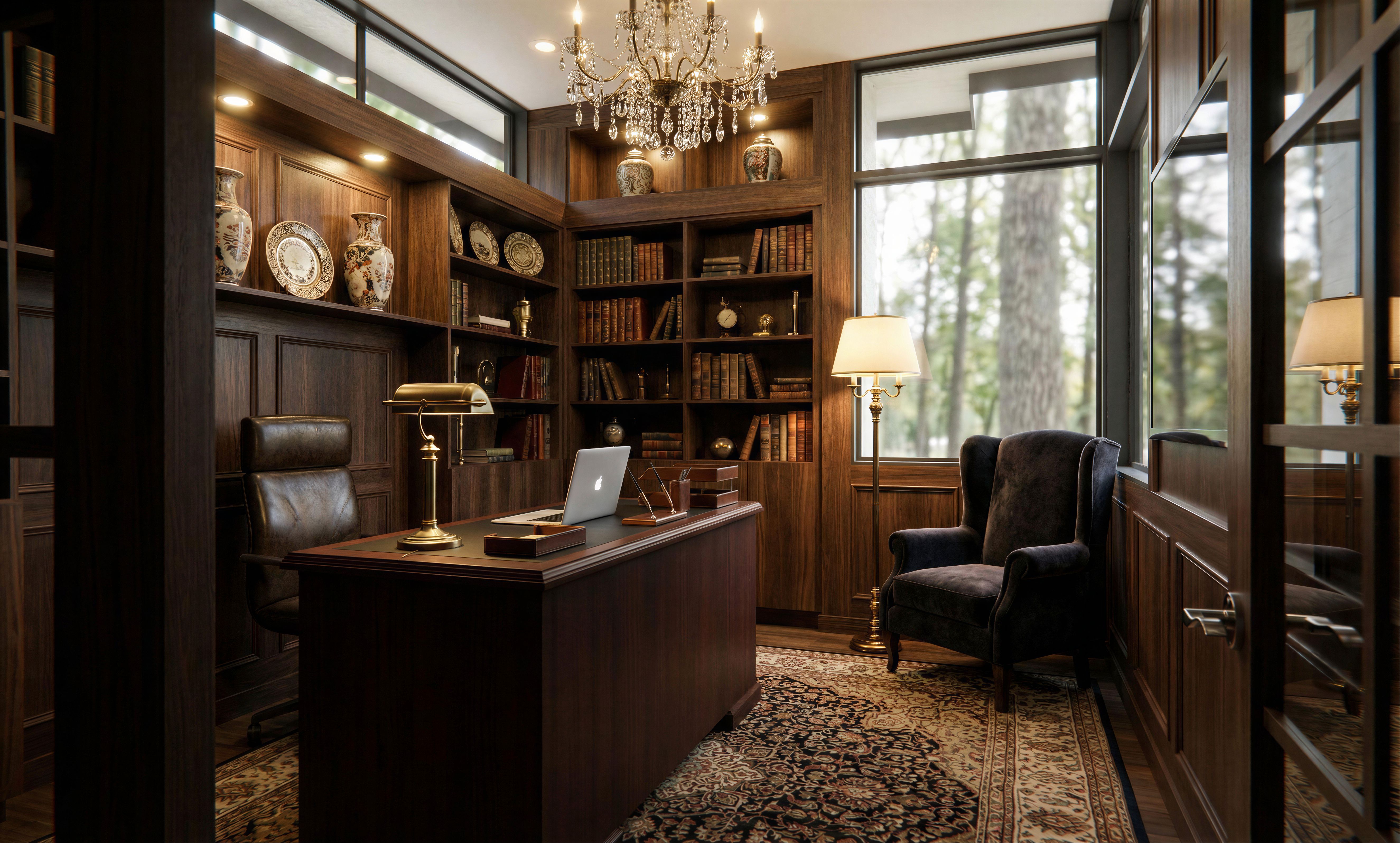make photorealistic rendering of office with classic luxury style, darker tones, vases and decorative plate in two upper cubies, books and misc. items in other bookshelves, one vintage brass desk lamp on the desk on the left of the desk, laptop in the middle of desk, add chandelier, add light fixtures, replace desk chair, floor lamp and sofa chair with classic luxury style ones, add can lights in the soffit above the desk chair, turn on light fixtures, add misc. items where appropriate, tall deciduous trees view outside of windows, blur the outside view, keep exact camera angle, keep exact camera angle