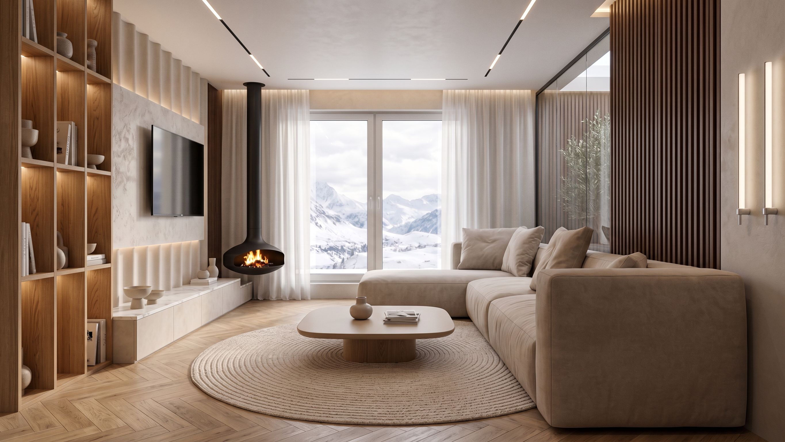 Ultra-realistic modern living room TV wall, soft minimal luxury style, warm neutral palette, organic forms and textures. Feature wall composed of sculptural fluted paneling in soft beige fabric/plaster finish, creating smooth vertical wave patterns with soft shadows. Center TV backdrop in textured microcement/plaster finish, light warm grey tone, slightly rough surface. Floating TV console in light beige microcement finish with seamless joints and minimal detailing. Console top surface in polished marble slab, white base with subtle grey veining, soft reflections. Left side: built-in shelving unit in natural oak wood, warm tone, matte finish, integrated warm LED strip lighting inside niches. Right side: vertical dark walnut wood slats, adding contrast and depth. Flooring: natural oak parquet in herringbone pattern, matte finish, warm tone. Area rug: round textured rug in soft beige with subtle concentric pattern and raised texture. Coffee table: Organic rounded shape, matte lacquer or microcement finish in warm beige, central wooden base in natural oak. Fireplace: Modern suspended fireplace in matte black metal, soft fire glow adding warm contrast. 💡 LIGHTING key to realism Hidden LED strip lighting behind fluted wall warm 3000K, creating soft gradient shadows Recessed ceiling linear lights, minimal and diffused Shelf integrated lighting warm, subtle glow Natural daylight entering from side window through sheer curtains, soft and diffused Fireplace adds dynamic warm flickering light Balanced lighting: soft shadows, no harsh contrast, realistic falloff 🪴 DECOR & STYLING realistic + minimal On console: Ceramic bowls and vases in matte neutral tones Small stack of books On coffee table: Minimal ceramic vase Books or magazine stack Shelves: Mix of ceramics, books, and small sculptures Slightly asymmetrical arrangement not too perfect Add: Light fabric curtains with soft folds Subtle imperfections wrinkles, dust, texture variation ✨ REALISM BOOST Slight imperfections in plaster and microcement Natural variation in wood grain Soft reflections on marble and lacquer surfaces Ambient occlusion in corners and joints Realistic fire glow and light interaction Subtle noise/grain for photorealism 🎥 CAMERA & RENDER SETTINGS Eye-level shot, centered composition Lens: 28–35mm Photorealistic, global illumination, ray tracing Soft cinematic contrast 8K resolution, ultra-detailed textures, keep exact camera angle