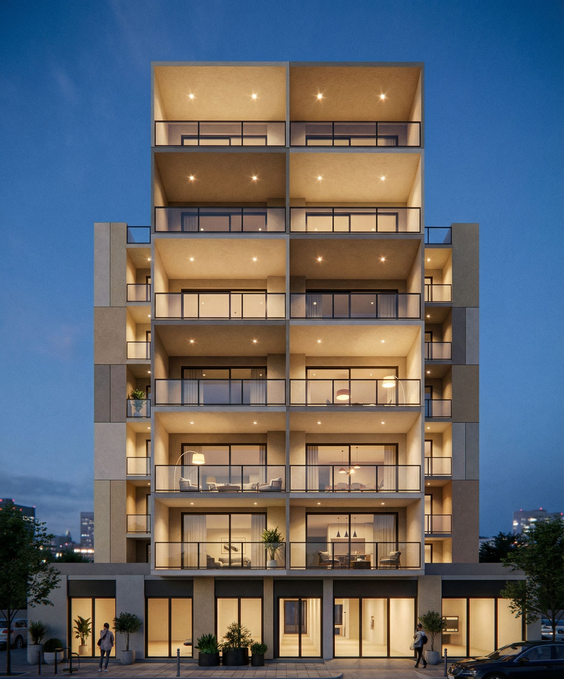PromptUltra realistic architectural render of the provided building model. STRICT GEOMETRY PRESERVATION Use the provided building image strictly as the base reference. Do not modify the architecture in any way. Do not change building shape, volumes, slabs, window placement, balconies or proportions. Keep the exact camera angle and building silhouette. IMPORTANT Strictly keep the original glass balconies. Do not replace, modify or redesign the glass railings. The balcony guardrails must remain transparent glass panels exactly as in the original model. Façade treatment Apply a contemporary façade treatment using textured stucco crépis panels in a vertical patchwork composition. Color palette light beige sand taupe soft greige warm stone Texture variation fine mineral plaster slightly rough stucco brushed plaster finish Clean vertical segmentation with precise joints. Balconies Keep original balcony geometry and glass railings. Recessed balconies with darker inner tones creating depth and warm taupe shadows. Transparent glass balcony railings preserved exactly as in the original model. Window frames matte black or dark bronze aluminum. Balcony lighting Add integrated recessed ceiling spotlights in balcony slab soffits. Lighting warm white lighting between 2700K and 3000K soft light wash on balcony walls subtle glow under balcony ceilings Interior lighting Visible interior apartment lighting through windows warm ambient lighting floor lamps pendant lights soft bedroom lighting Natural variation between units. Atmosphere Time of day blue hour early evening. Balanced contrast between cool natural sky and warm building lights. Rendering quality photorealistic global illumination soft shadows ambient occlusion micro material detail High-end architectural visualization in ultra realistic quality with the exact original camera angle preserved., keep exact camera angle