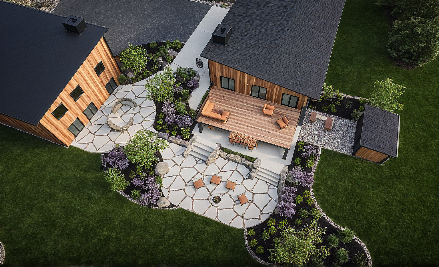 landscaping, teak siding, lawn, flagstone patio, mulch, concrete driveway, lawn furniture, junipers, river birch, lilac