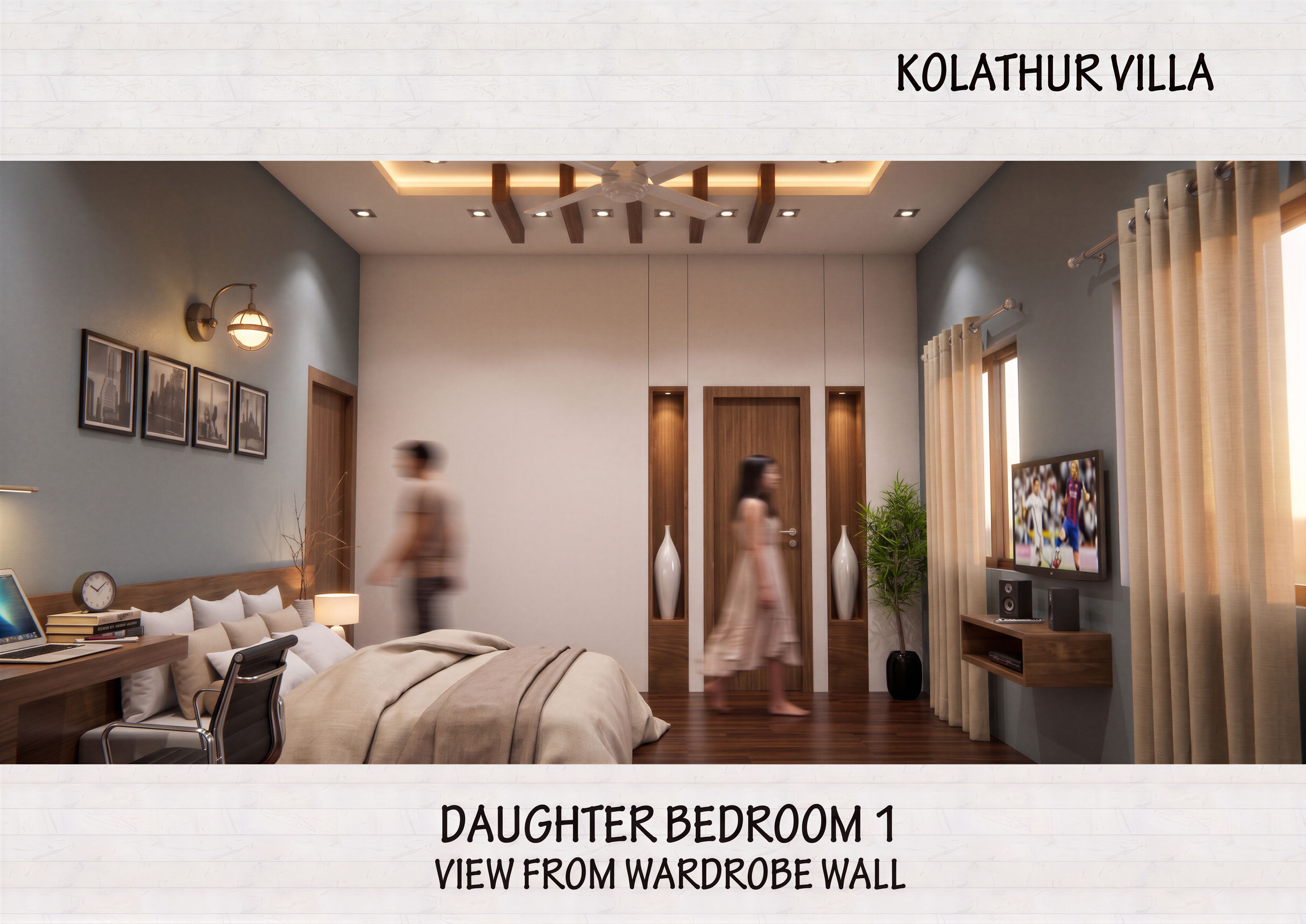 EnhancedPromptMake a high quality rendered photo realistic view of this uploaded daughter's bed room. maintain the same furniture style and finishes like a uploaded reference image. Uploaded source image and reference image are same bed room Views but in different camera angle. Correction in the airender.studio rendered image- delete ward robe and dresser mirror furniture detail from the view., keep exact camera angle