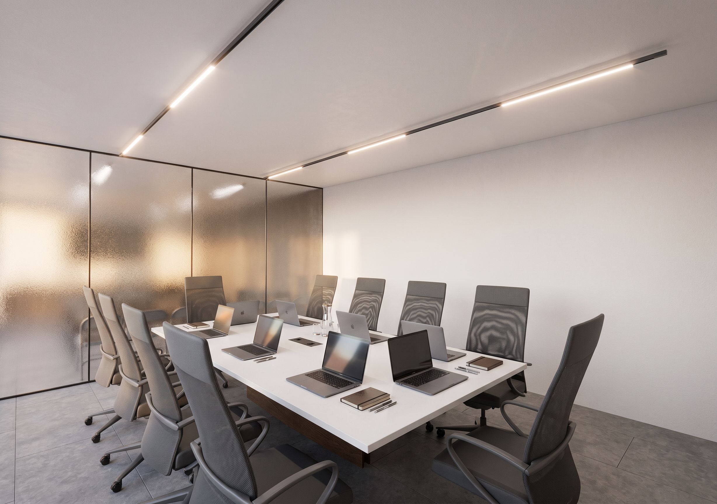 cambia la mesa a color blanco, y las sillas a color gris, añade ordenadores a la mesa y añade el efecto de la luz , keep exact camera angle