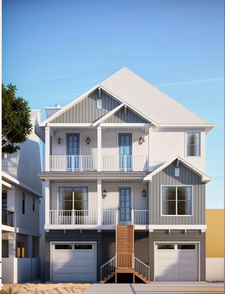 Promptnew construction drawing, three-story home, located on the beach. Trim is white, railings are white. house is light blue