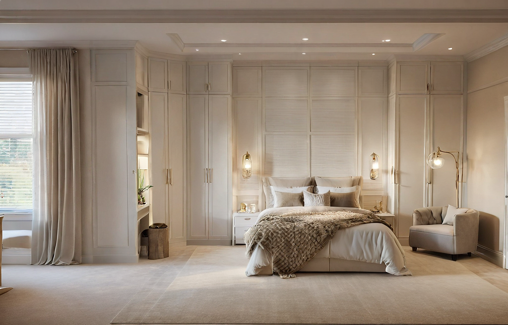 PromptAmerican classic bedroom interior. Warm and calm ambient, with offwhite wainscoating panel and cabinet door.Full soft cream carpet floor. with warm ambient indirect lighting