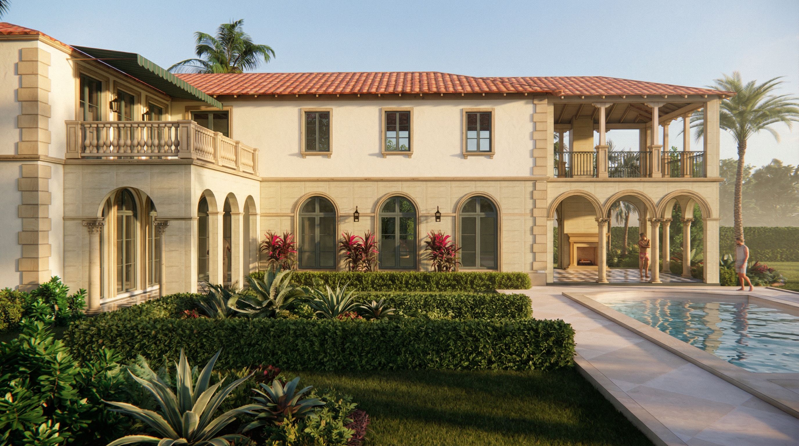 Use the uploaded image as the base reference for building massing, architecture, and layout. Maintain the same architecture, proportions, openings, and composition. Refine and enhance the image to achieve a highly photorealistic, cohesive architectural rendering with consistent lighting, materials, and camera behavior. ARCHITECTURE LOCKED Preserve all building geometry exactly as shown. Do not change: massing roof forms arches and columns window and door placement loggia and balcony structure Only refine material realism and detailing. CAMERA + LENS CRITICAL FOR REALISM Use a real-world architectural photography camera setup: camera height: approximately 5–6 feet above ground lens: 28–35mm full-frame equivalent straight verticals no distortion natural perspective not wide-angle exaggerated Subtle depth of field: very slight background softness keep architecture sharp and in focus LIGHTING MATCH HIGH-END REAL ESTATE PHOTOGRAPHY Lighting should be: late afternoon around 3–5 PM warm, natural sunlight sun positioned to illuminate the main façade directly not side-lit or backlit soft, realistic shadow edges balanced exposure no blown highlights, no overly dark shadows Add: soft global illumination bounce light from ground and walls warm reflected light from paving and stucco subtle sky fill light Avoid: dramatic contrast overly stylized lighting harsh shadows ATMOSPHERE slight atmospheric haze very subtle Florida coastal humidity in the air soft light diffusion This should feel like a real photograph, not a crisp CG render. MATERIAL REALISM VERY IMPORTANT All materials must have micro-detail and imperfection: stucco: subtle tonal variation, slight unevenness stone: natural variation, small imperfections, soft edges wood: visible grain and slight weathering glass: realistic reflections and slight tint metal: soft reflections, not mirror-like Hardscape: limestone or shellstone subtle color variation realistic joints and edge wear Avoid: flat surfaces perfectly uniform textures overly sharp edges LANDSCAPING LUXURY + RICHNESS Enhance landscaping to feel lush, layered, and high-end while maintaining layout. reduce large empty lawn feeling introduce layered planting beds structured hedges + softer planting sculptural plants used intentionally refined, restrained color palette Landscape should feel: mature curated integrated with architecture LOGGIA FIREPLACE The back wall of the loggia should be a Mediterranean-style fireplace: stone or stucco surround simple classical detailing centered and proportionate warm and inviting focal element POOL + WATER Keep pool layout exactly as shown. Enhance: realistic water reflections slight surface movement correct depth perception LIFESTYLE SUBTLE Keep existing person. Optional: add at most one additional person Figures should be: natural secondary not staged FINAL RESULT The image should look like a real luxury architectural photograph: soft, natural lighting realistic materials balanced exposure cohesive atmosphere A refined Palm Beach Mediterranean estate with a calm, luxurious, lived-in feel. DO NOT do not change architecture or layout do not distort perspective do not create dramatic or stylized lighting do not leave flat or artificial materials Only refine realism, lighting, and richness., keep exact camera angle