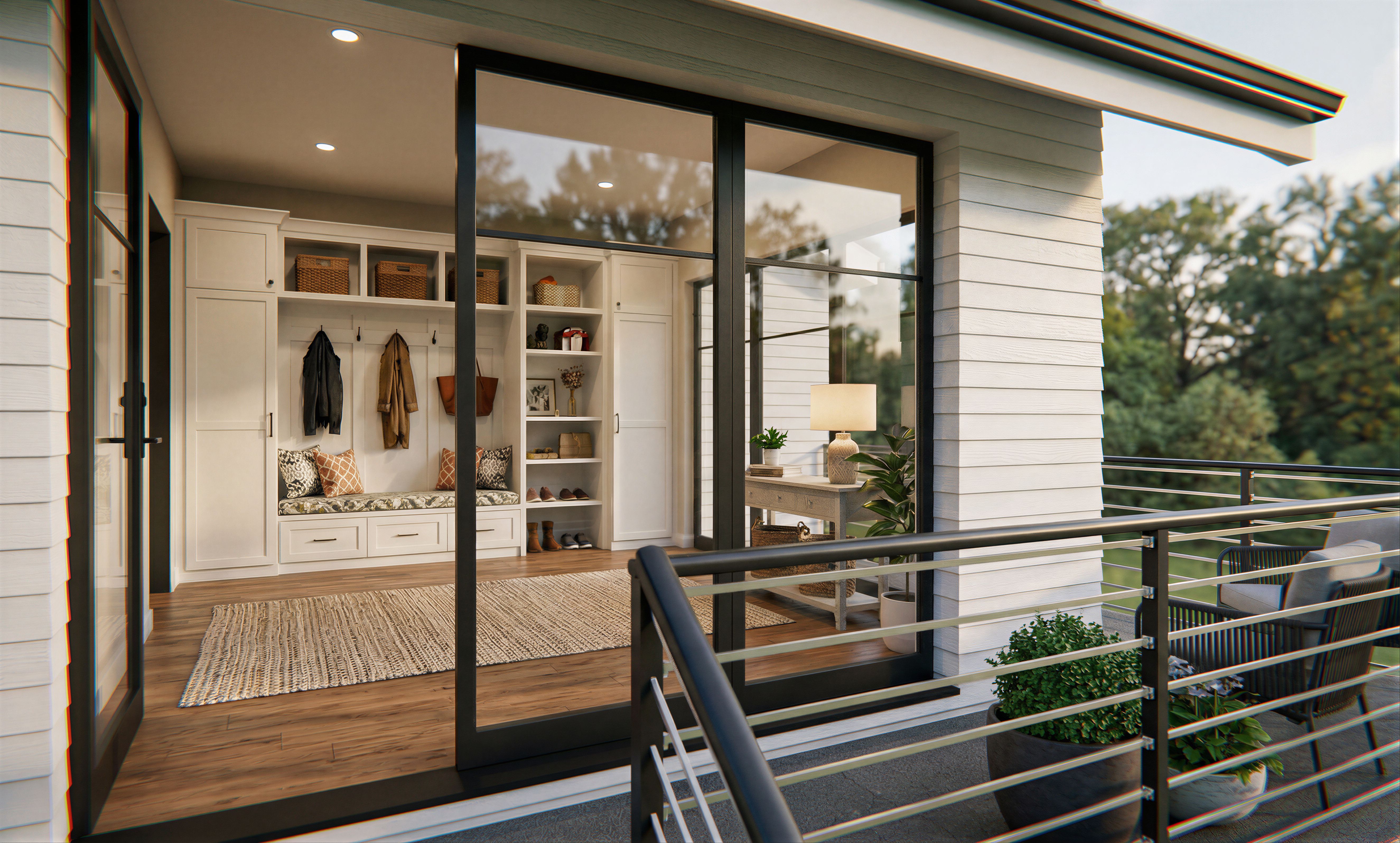 This room with balcony is on the second floor, size of the room itself is 12 feet by 12 feet, balcony around the room is 3 feet 6 inches wide, make the room into Guest Entry with Mudroom, mudroom built-ins are on the back wall, add other misc. items as appropriate, trees in the background, blur the background, keep exact camera angle