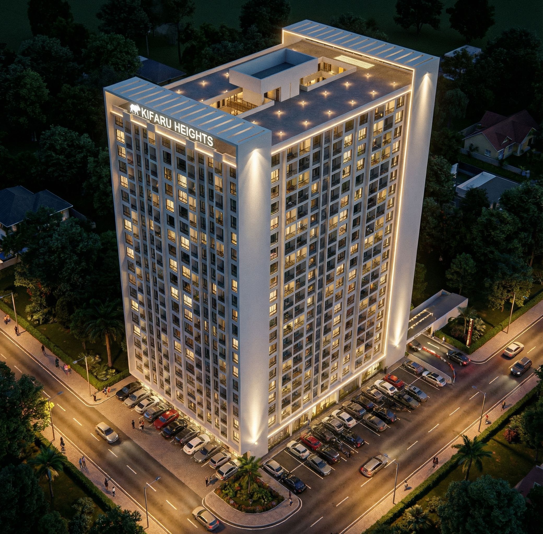 PERSPECTIVE SHOWING AN APARTMENT IN A RESIDENTIAL SUBURB WITH LIGHTS TURNED ON IN THE BUILDING. INCLUDE SOME SPOT LIGHTS, ROPE LIGHTS AND STREET LIGHTS IN THE IMAGE. INCLUDE SOME VISITORS PARKING IN FRONT OF THE BUILDING. PUT VEHICULAR ENTRY AND EXIT ON THE RIGHT SIDE. MAKE GLASS CLEAR, REFLECTIVE AND REALISTIC. USE WHITE WALL MASTER AS A FINISH. INCLUDE GRAPHICS."KIFARU HEIGHTS" ON THE BUILDING. MAKE COLOUR OF BUILDING PEARL WHITE., keep exact camera angle. MAINTAIN THE ORIGINAL DESIGN. MAINTAIN ORIGINAL ARCHITECTURAL DESIGN., keep exact camera angle. USE ORIGINAL ARCHITECTURAL DESIGN AND CAMERA ANGLE. SHOW WHOLE BUILDING., keep exact camera angle