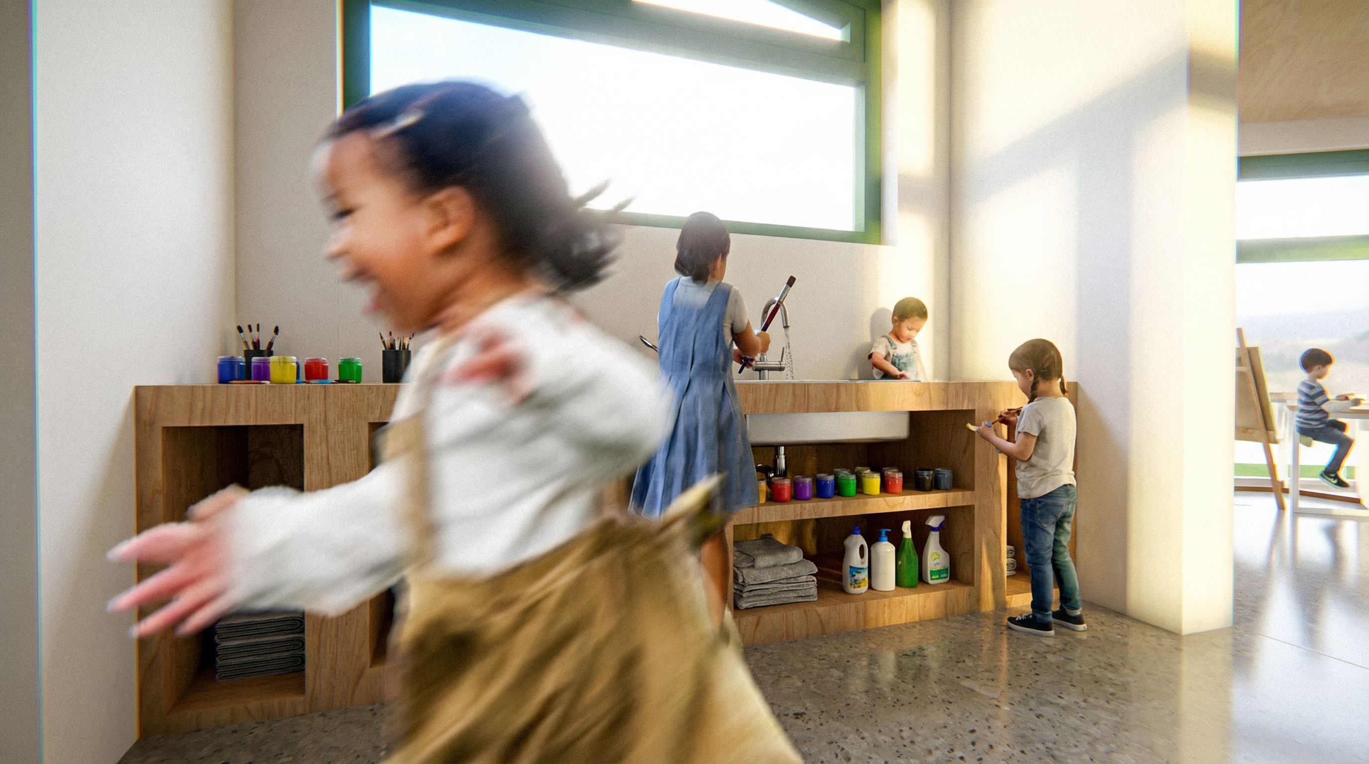 PromptWaschraum, wo Pinsel ausgewaschen werden. Nicht zum Zähne putzen. Editiere personen, die schon drin sind realistischer, keep exact camera angle