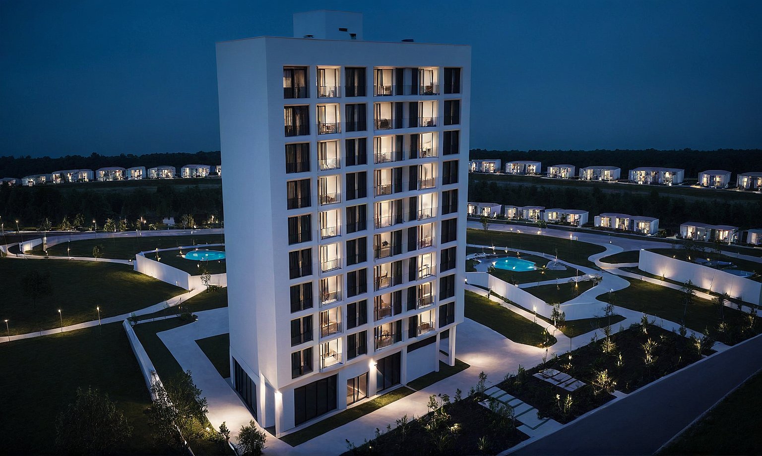 Promptlandcape, luxury apartments, night atmosfere, modern white facade, lodges