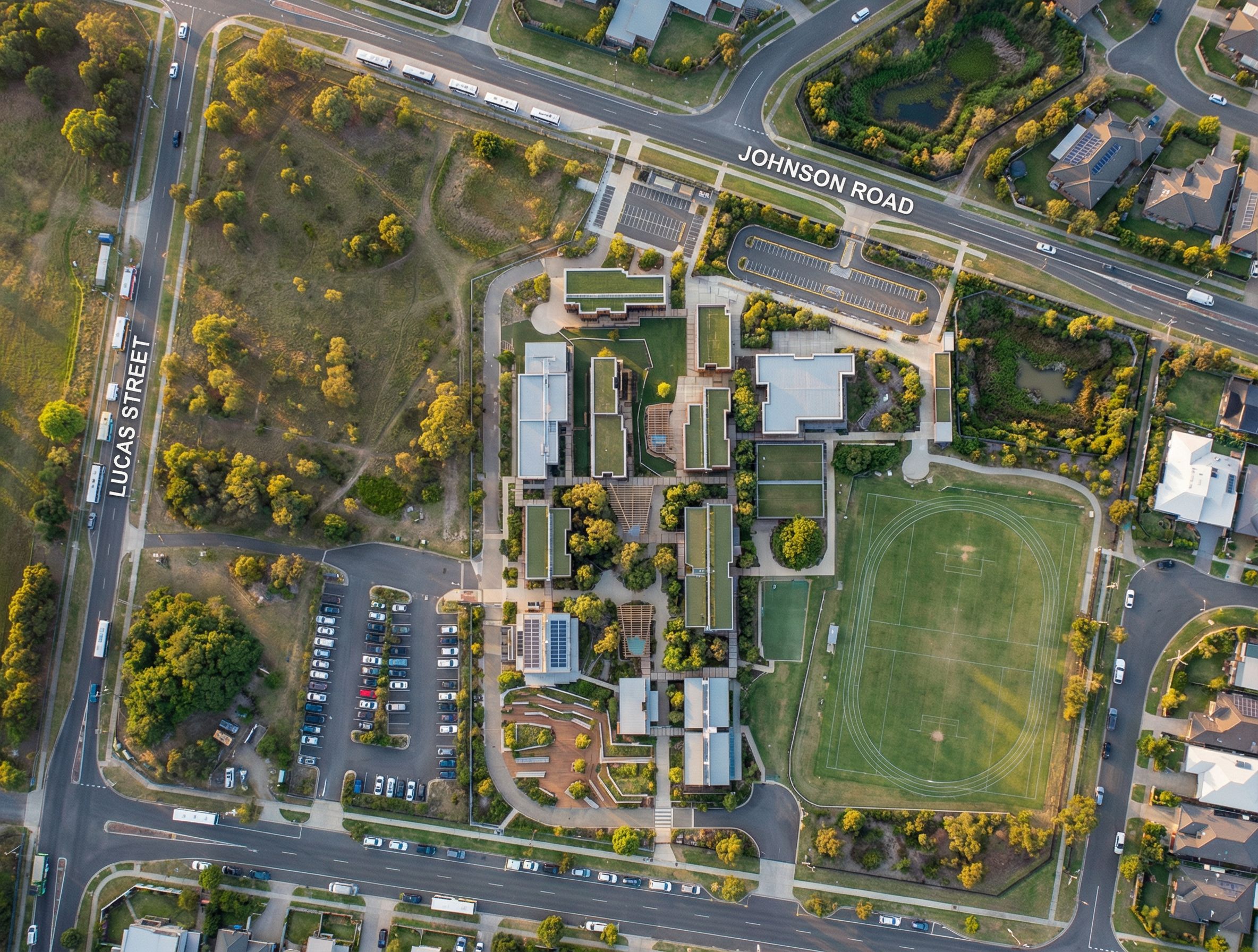 Photo of an educational facility complex featuring modular buildings and connected outdoor areas. Emphasize contemporary architectural elements like extensive glazing, terraced seating, and green canopies. The campus is set in a landscaped urban context with nearby streets and shaded pathways. Natural daylight creates soft shadows across the structures during the golden hour. Capture a bird's-eye view with a wide-angle lens, focusing on the layout of buildings, access points, and recreational areas, showcasing the blend of functionality and aesthetic appeal in a vibrant community environment. remove all text except street names. top right hand area that is an light army green is a bio retention are so show as such with a fence around it. retain use the photo image underlay of the upload image as the base for the site. leave the area to the left hand side as undeveloped grasslands, add vehicles to the carparks and Johnson road and Lucas street. dont add any other buildings, just render what is shown