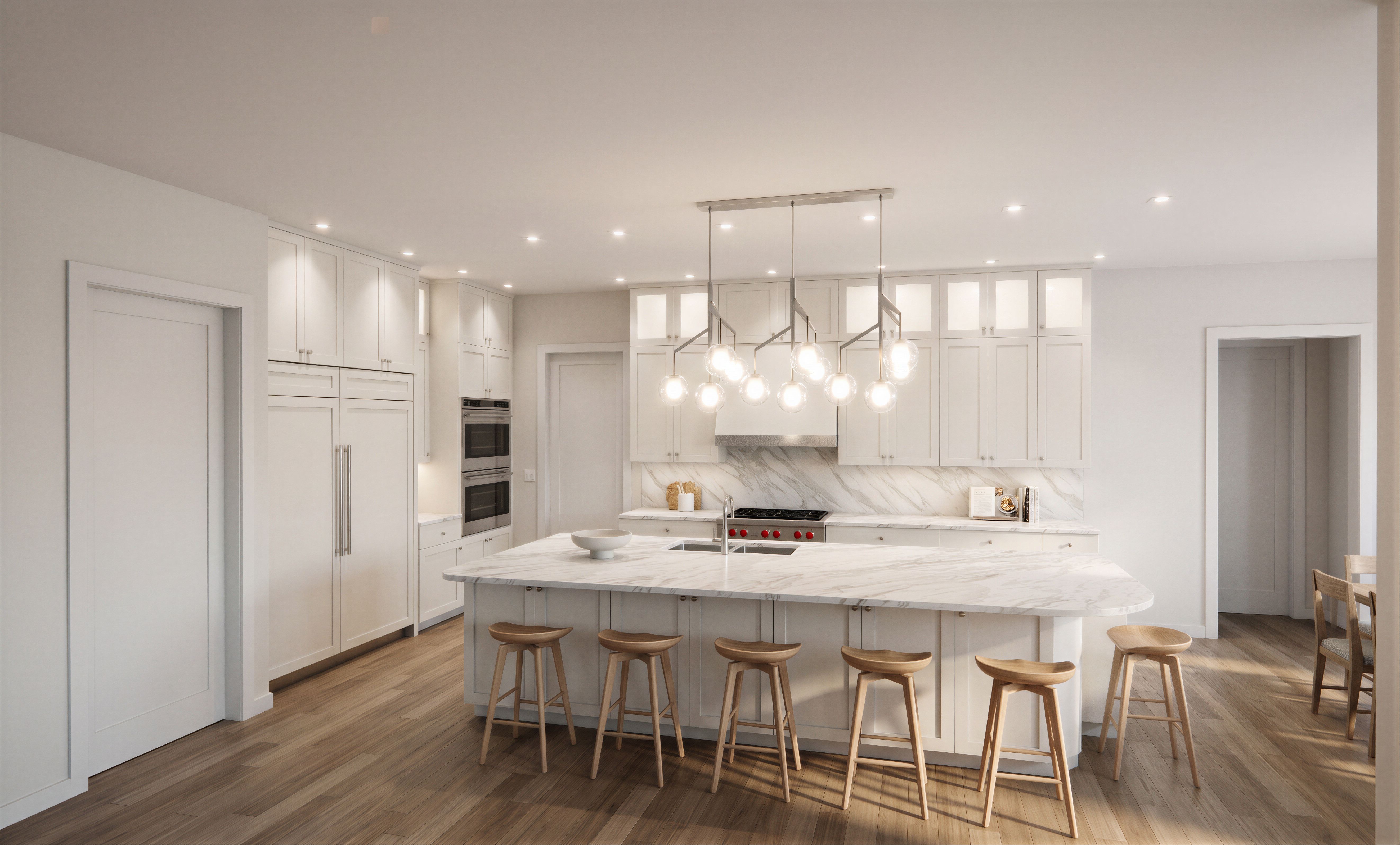 make photorealistic rendering of this kitchen; light fixtures on, bright room; do not open door, which are not opened; lower wall cabinets have no glass; very top cabinets at the ceiling have opaque glass, but no glass in cabinet over the hood do not add cabinets which are not there do not add chair and table which are not there keep exact camera angle, keep exact camera angle