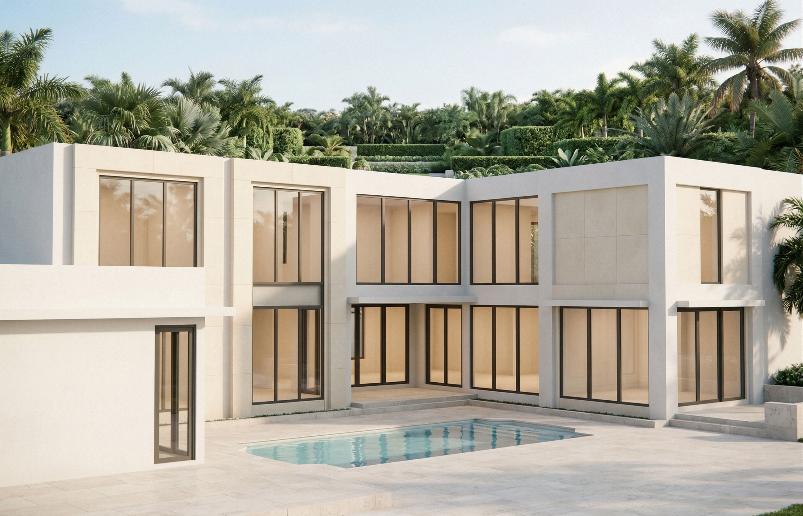 Ultra photorealistic architectural rendering using the provided 3D model as the exact base. DO NOT CHANGE ANYTHING: Do not alter massing, proportions, geometry, windows, doors, or layout. Use the model exactly as given. Only improve materials, lighting, and realism. STYLE: High-end Palm Beach contemporary Regency residence, luxury real estate photography look. LIGHTING: Late afternoon sunlight around 3 PM with the main façade fully lit. Bright, even lighting across all surfaces. Soft, controlled shadows. Slightly warm sunlight not orange. Overall image should be bright, crisp, and well balanced. INTERIOR LIGHTING IMPORTANT: Interior spaces are softly illuminated with warm ambient light, creating a glowing effect through the windows. The interior should NOT be clearly visible or detailed — no furniture or objects should be distinguishable. The glass should have slight opacity and reflection so the interior reads as a soft warm glow, not transparent. MATERIALS: Smooth white stucco with slight warmth and matte texture Light cream limestone surrounds, smooth with no visible joints Dark bronze/charcoal window frames, thin and modern Realistic glass with soft reflections and limited transparency HARDSCAPE: Light natural limestone paving, honed finish, subtle color variation, not shiny. POOL: Same shape as model, soft aqua-blue water, gentle ripples, realistic reflections. LANDSCAPE: Lush Palm Beach tropical planting with palms, hedges, and layered greenery. Clean and high-end. CAMERA: Same exact perspective as the model. Wide-angle “money shot” with pool in foreground. RENDER QUALITY: Ultra photorealistic, global illumination, soft bounce light, realistic material roughness, no plastic look. ANTI-CARTOON: No flat surfaces, no overly sharp edges, no pure black glass, no overly glossy materials., keep exact camera angle
