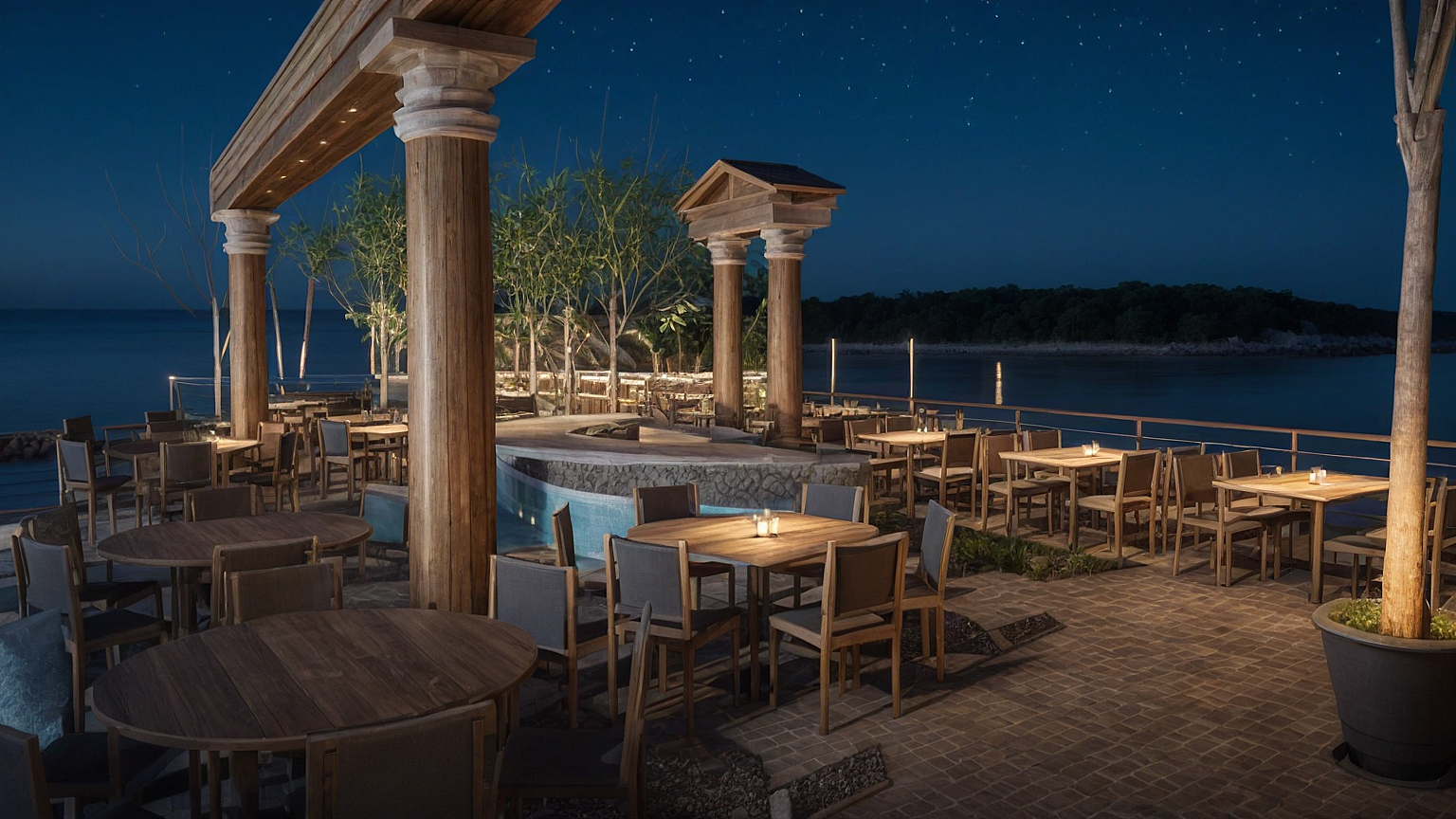 PromptExterior of a restaurant with creek style looking over the sea at night