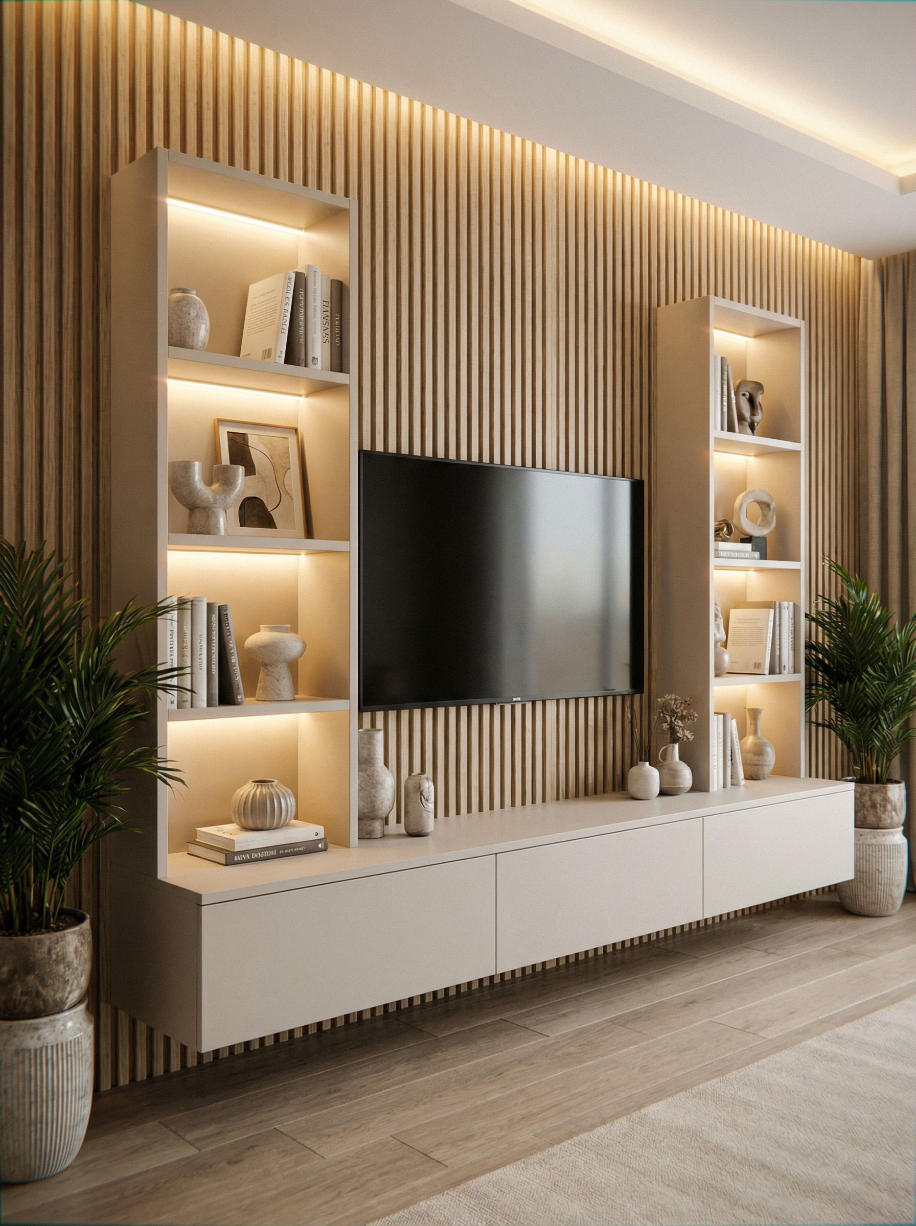 Promptpasar la distribución de muebles del alzado que está en líneas a esa misma distribución pero en perspectiva 3d similar a la imagen de referencia, poniendo un mueble librería a la izquierda y otro igual a la derecha y utilizando el material de revestimiento referencia y la misma gama cromática de la imagen de referencia., keep exact camera angle