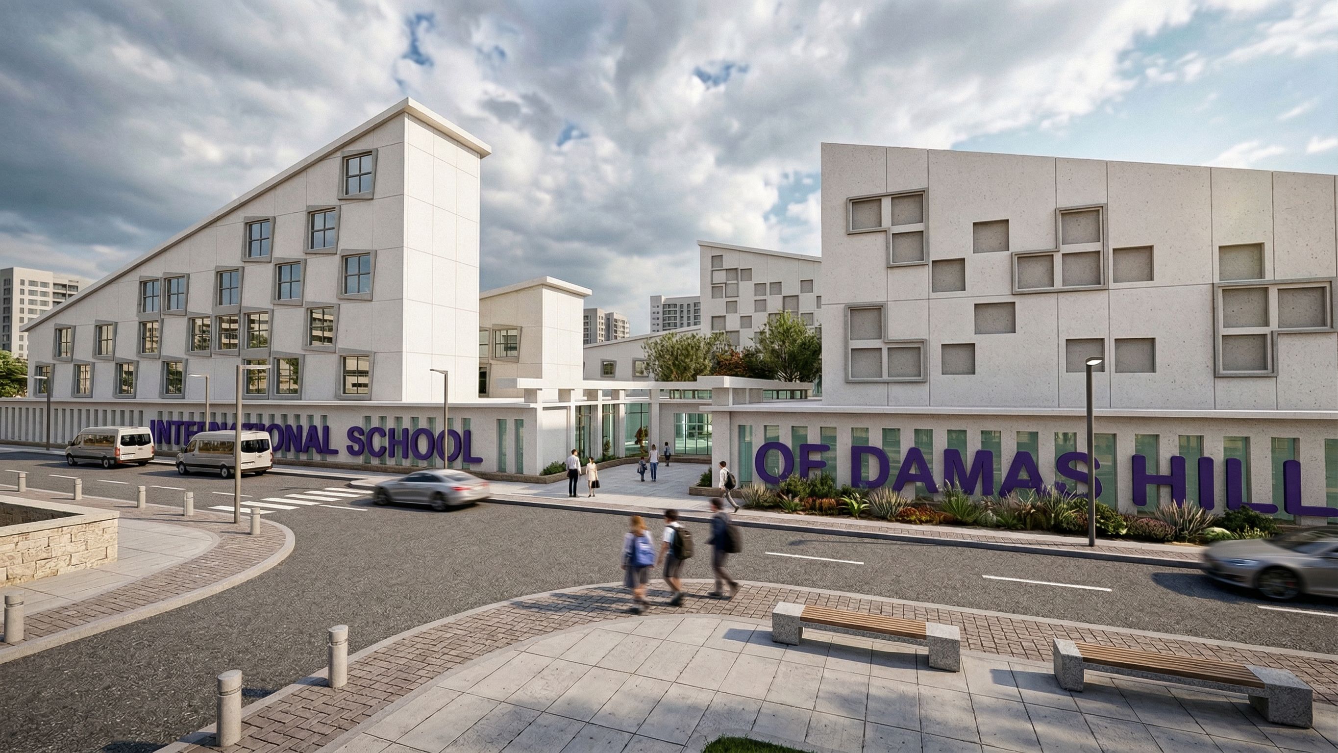 PromptPhoto of a modern school complex featuring sleek, geometric facades with large, irregular windows, emphasizing the interplay of light and shadow. The setting includes a well-paved entrance surrounded by landscaped greenery and nearby buildings that enhance the urban aesthetic. The scene is illuminated by soft, natural daylight under a partly cloudy sky, showcasing vibrant colors and reflections. Captured from a low-angle perspective to highlight the architectural height and details, with a wide-angle lens to encompass the surrounding environment, creating a dynamic and inviting atmosphere., keep exact camera angle