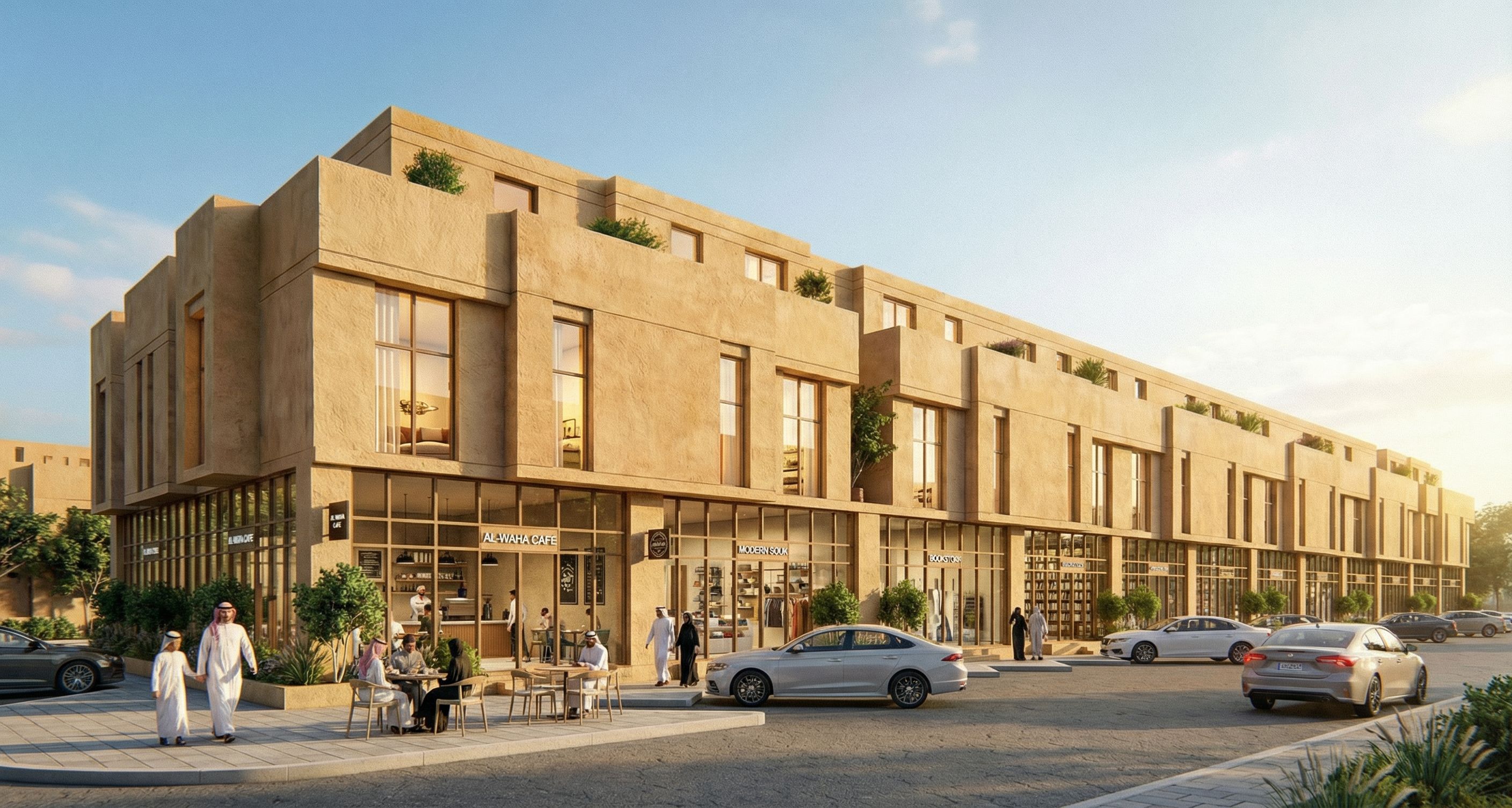 Add shops interior details cafe extra with signs names.. & appartments in first floor furniture, add saudi families & cars, keep exact camera angle