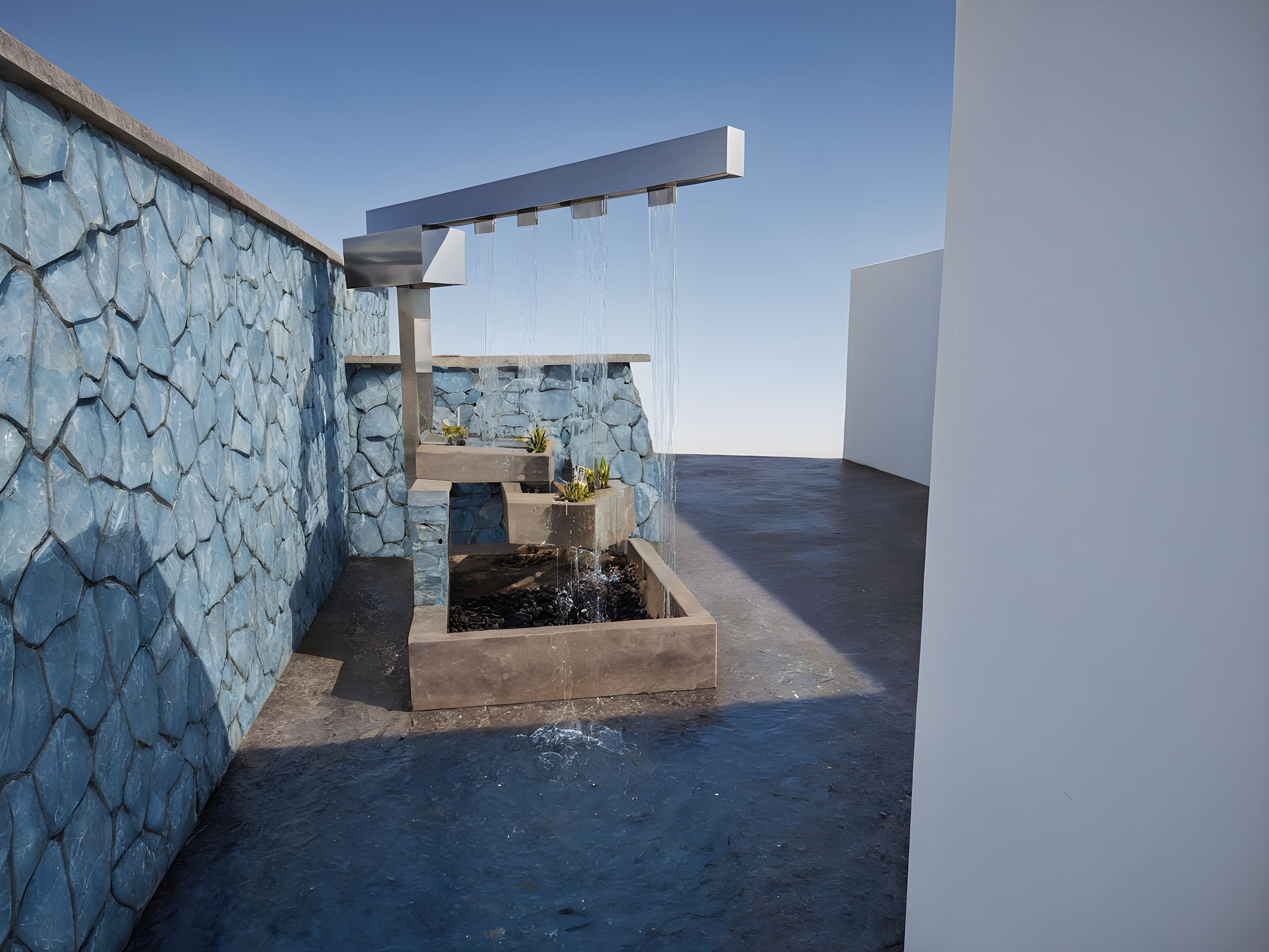 PromptAn outdoor fountain with 3 water basins (contain water) at different levels vertically. Water drips off the horizontal stainless steel feature at the top in 4 bands (let the 4 dripping water bands resemble droplets off a shower head with a light blue tone reflecting sunlight at a few points). Show waterfalling from the top most basin at 2 points into the second and middle basin and waterfalling from the middle basin into the lowest basin at two points (as in the reference image). Place a few tiny river rocks in the water basins with a few tiny lily plants in the lowest basin. Add tiny realistic splashes where the water drops into the basins. Give the brown basins a more textured greyish brown stone finish. Put a fade on the edges of the image. Ensure to capture waterfalls on the right side of the image, water falling from top basin into middle basin and finally into lowest basin. The 3 basins should have a stone-like finish (greyish brown). Close off the right side of image with a matching stone wall (as on the left side of image)