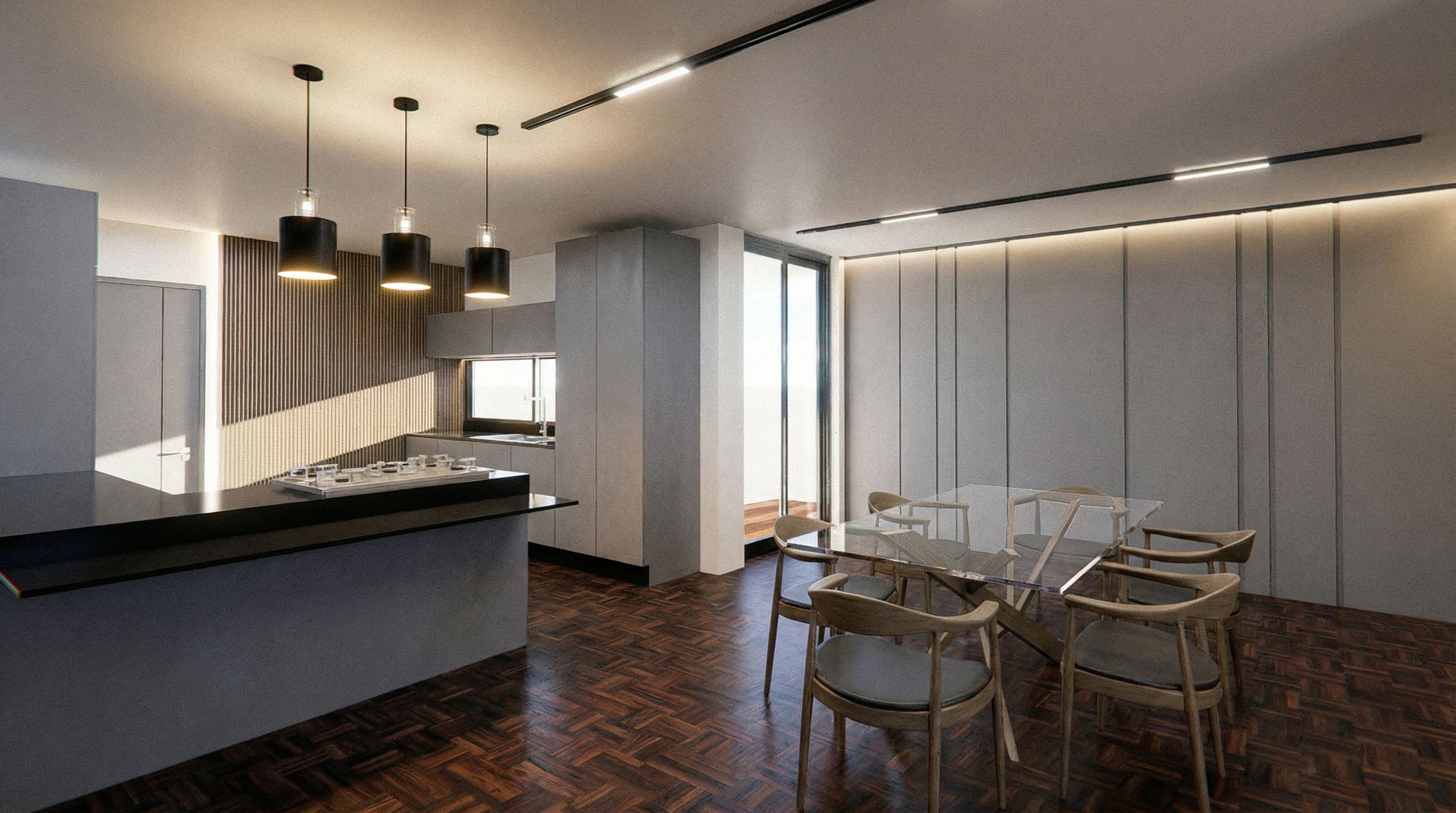 Promptporfa ayudame a cambiar el piso de este render por el que te adjunto como referencia y a añadir 3 lamparas como la que te puse en referencia arriba de la barra de la cocina de resto no cambies nada, pero manten el angulo amplio completo de la imagen , keep exact camera angle