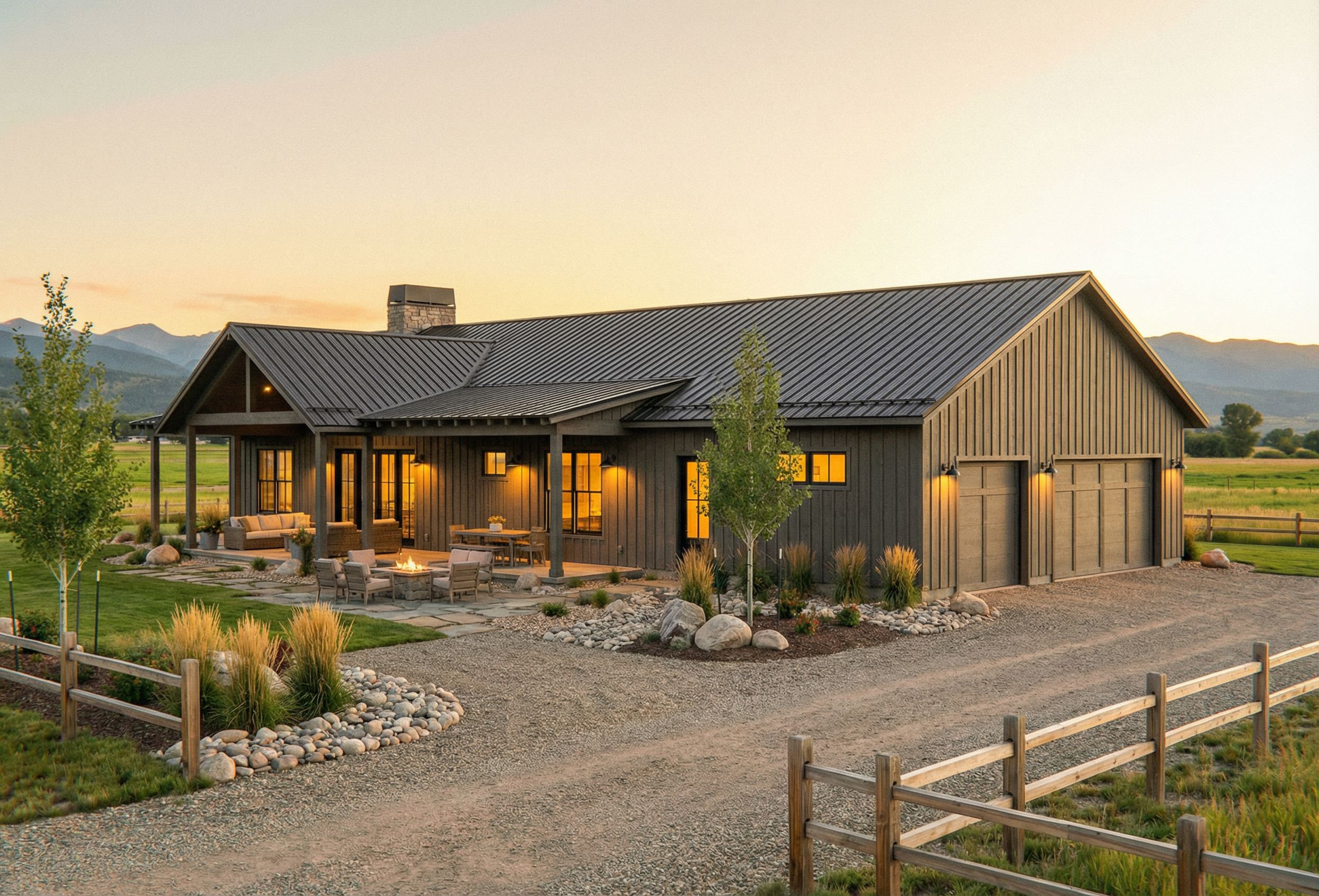 This is the back of the same home that is shown as a reference image. Complete the home image in the same exact style as the refence image and continue the theme of the reference image landscaping as it would apply to the back, entertaining area of this home., keep exact camera angle