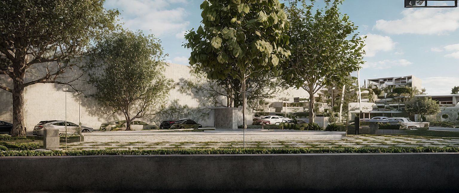 concreto pulido vegetación, jardín urbano, coches reales,