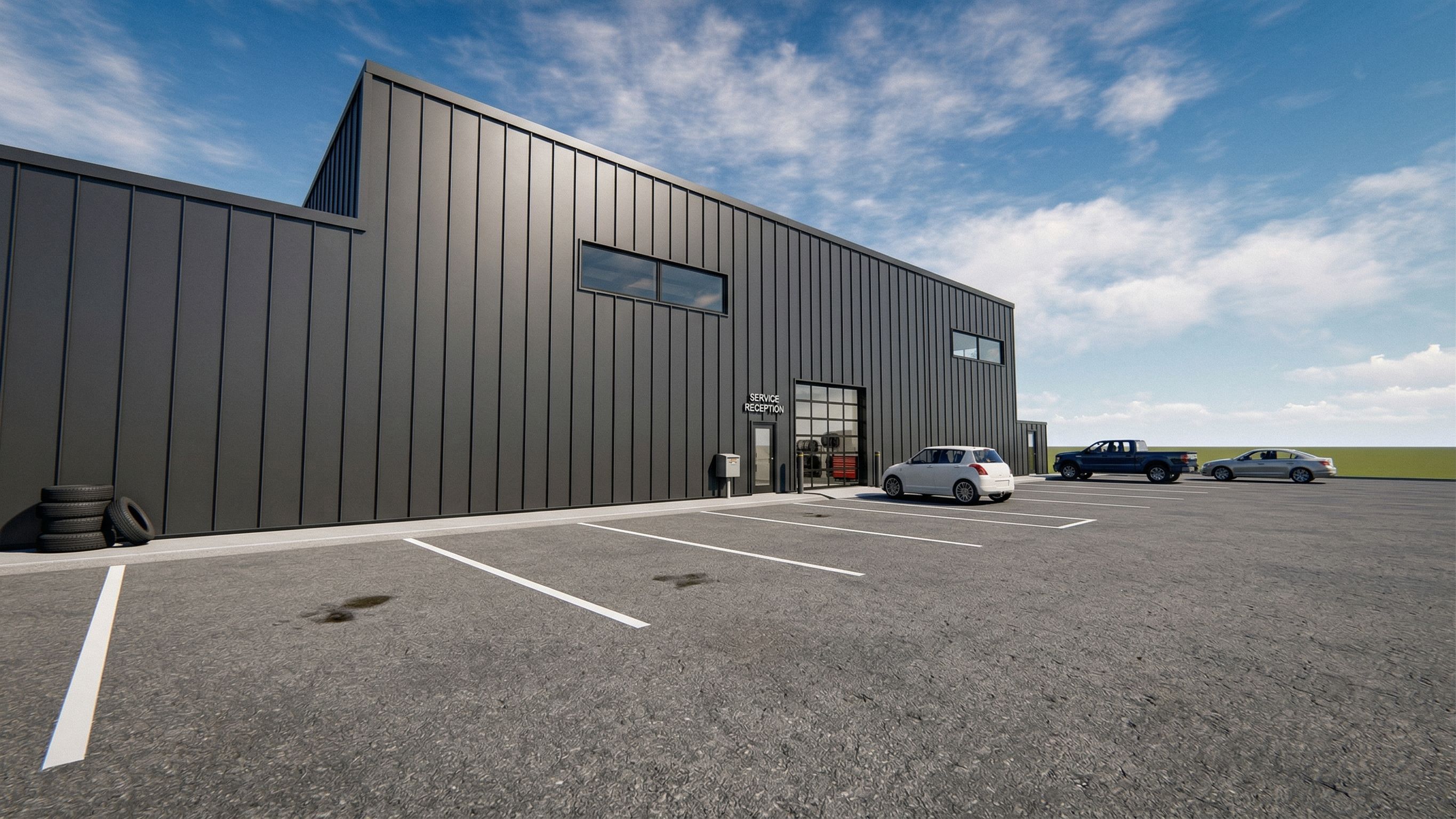Promptadd metal siding finish to the building material make the background like if car is going into the service shop dont add or change the angle dont add grass add like a parking alot please dont add extra door or windows , keep exact camera angle