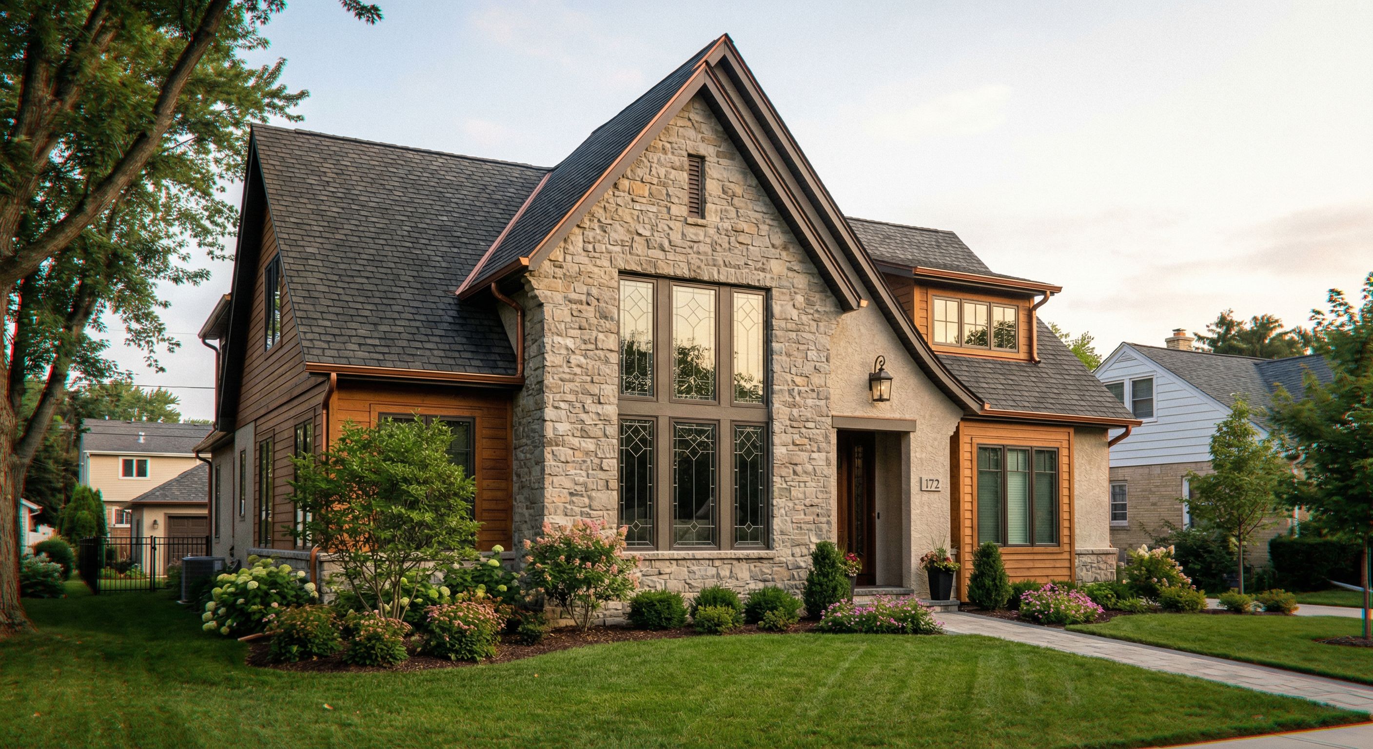 Photo of a contemporary house featuring a combination of stone, wood, and textured surfaces, highlighted by large, geometric windows and a steeply pitched roof. Set in a suburban environment with neatly manicured lawns and nearby residential structures, capturing a vibrant neighborhood feel. Soft morning light casts gentle shadows, enhancing architectural details. Framed from a front view, showcasing the entire facade with a low-angle perspective to accentuate height and complexity., keep exact camera angle