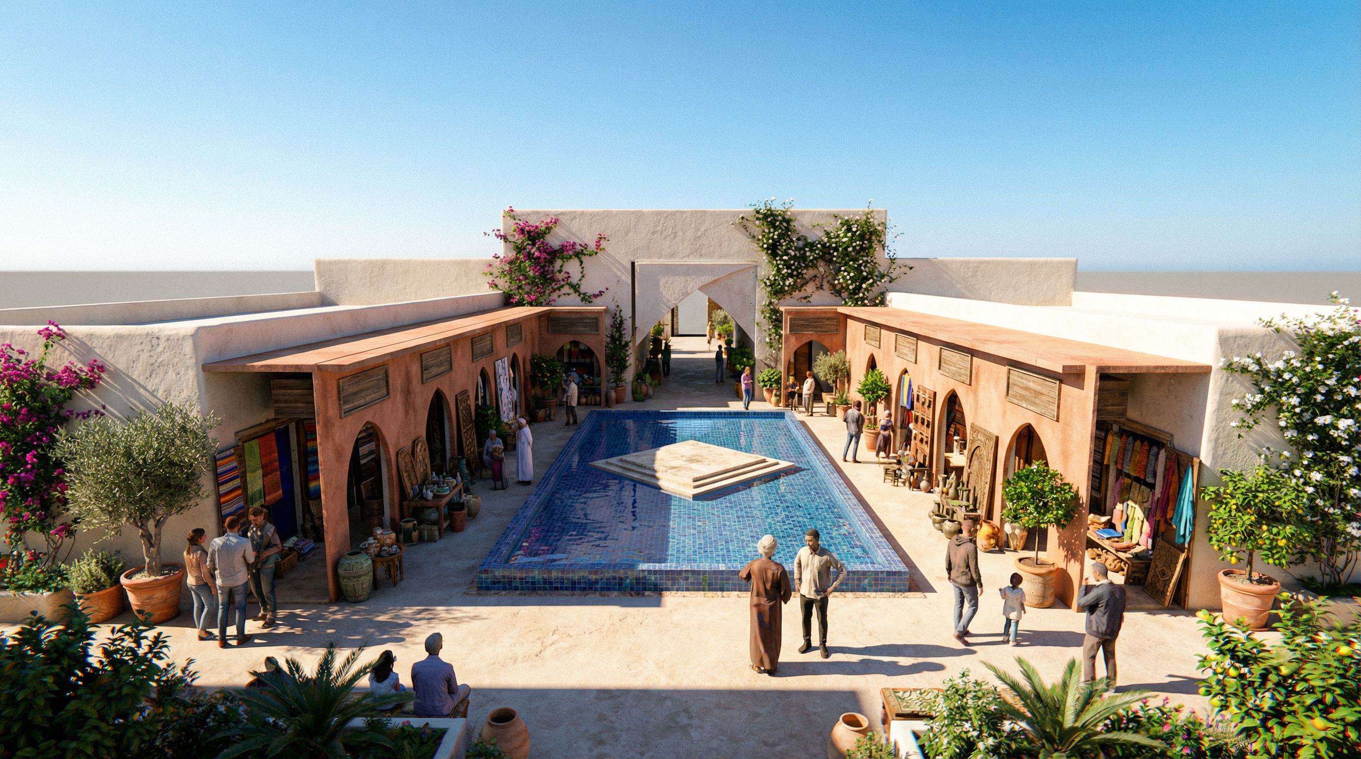 this is a courtyard of a traditional building of crafts and hand made products .. make this scene real and change the colors and add materials as you want just make the whole scene super realistic and well designed , keep exact camera angle