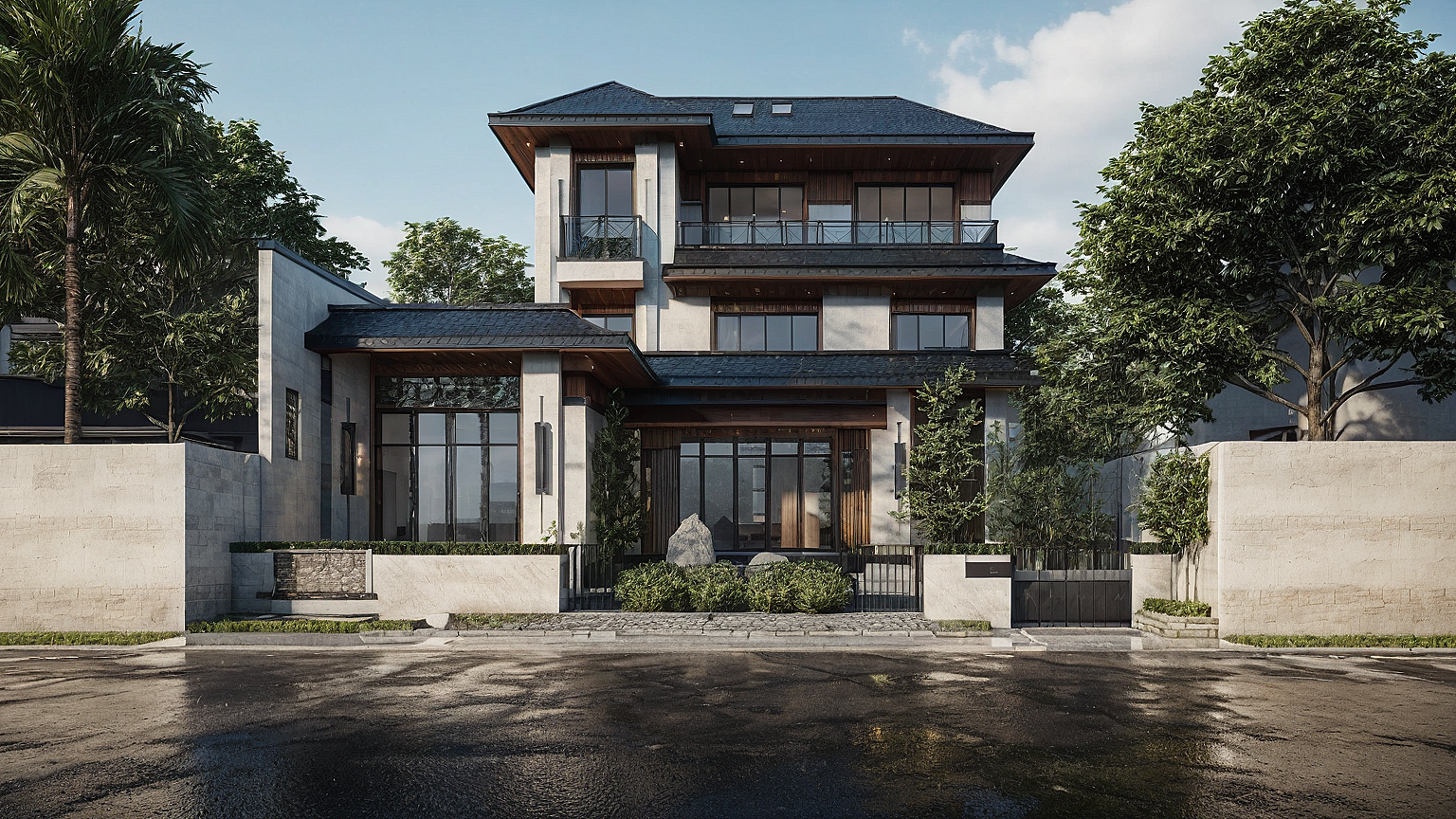 made realistic without changing the design, surrounding environment, materials and there is a wet road in front of it