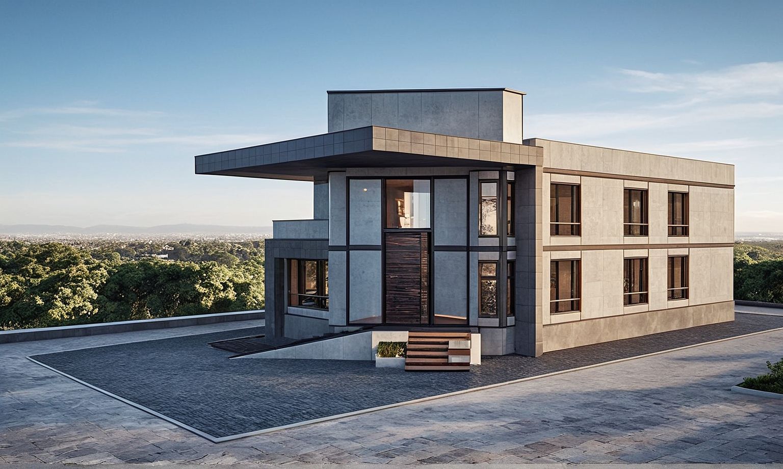 PromptPhoto of a modern residential building featuring a two-story structure with a flat roof. Architectural details include a textured stone facade, large glass windows, and a wooden door, surrounded by a minimalistic landscape. Urban setting with a geometric driveway leading to the entrance. Natural daylight highlighting the building's materials, creating soft shadows. Captured from a low angle to emphasize height, using a wide lens for a comprehensive view, showcasing both the building and its immediate environment.