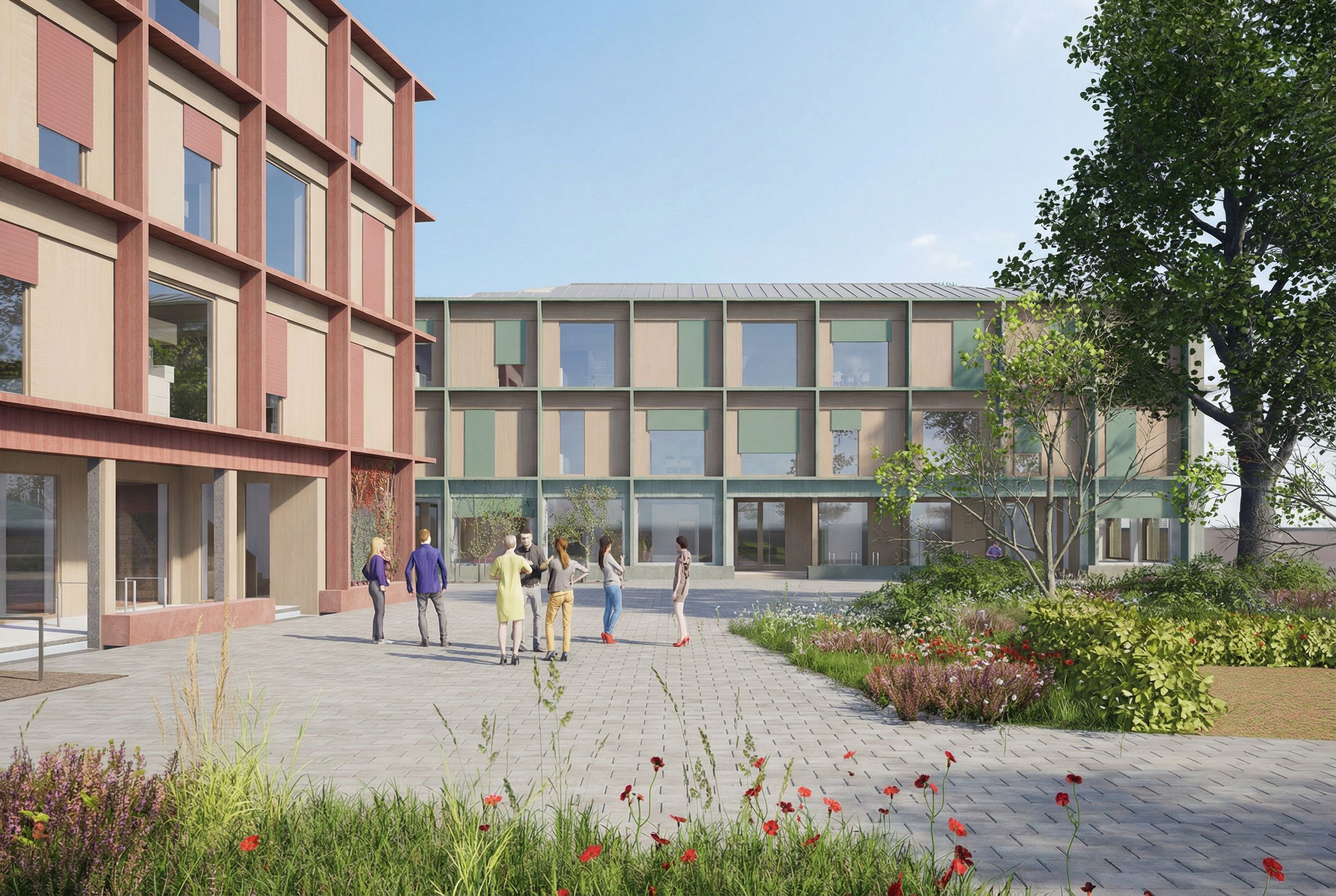 architectural exterior rendering, render this photo into photorealistic rendering, Create a high-resolution, photorealistic rendering of the provided architectural project. Follow the uploaded project file exactly with respect to: Geometry shapes, proportions, spatial arrangement Materials textures, surfaces, gloss levels, reflections Colors exact color tones, color relationships, material color fidelity The uploaded project file serves as the primary technical reference and should be reproduced as faithfully as possible. Use the separate mood/render-quality reference exclusively as inspiration for: Lighting atmosphere Overall mood Render quality and level of detail *Color temperature and visual tone The result should be a hyper-realistic rendering with fine material details, physically accurate lighting, soft gradients of shadow, realistic reflections, and convincing depth of field. Maintain a high-quality, professional visualization style. , eye level view, bright daylight, natural lighting, including people, greenery and vegetation, high quality, professional, detailed scene