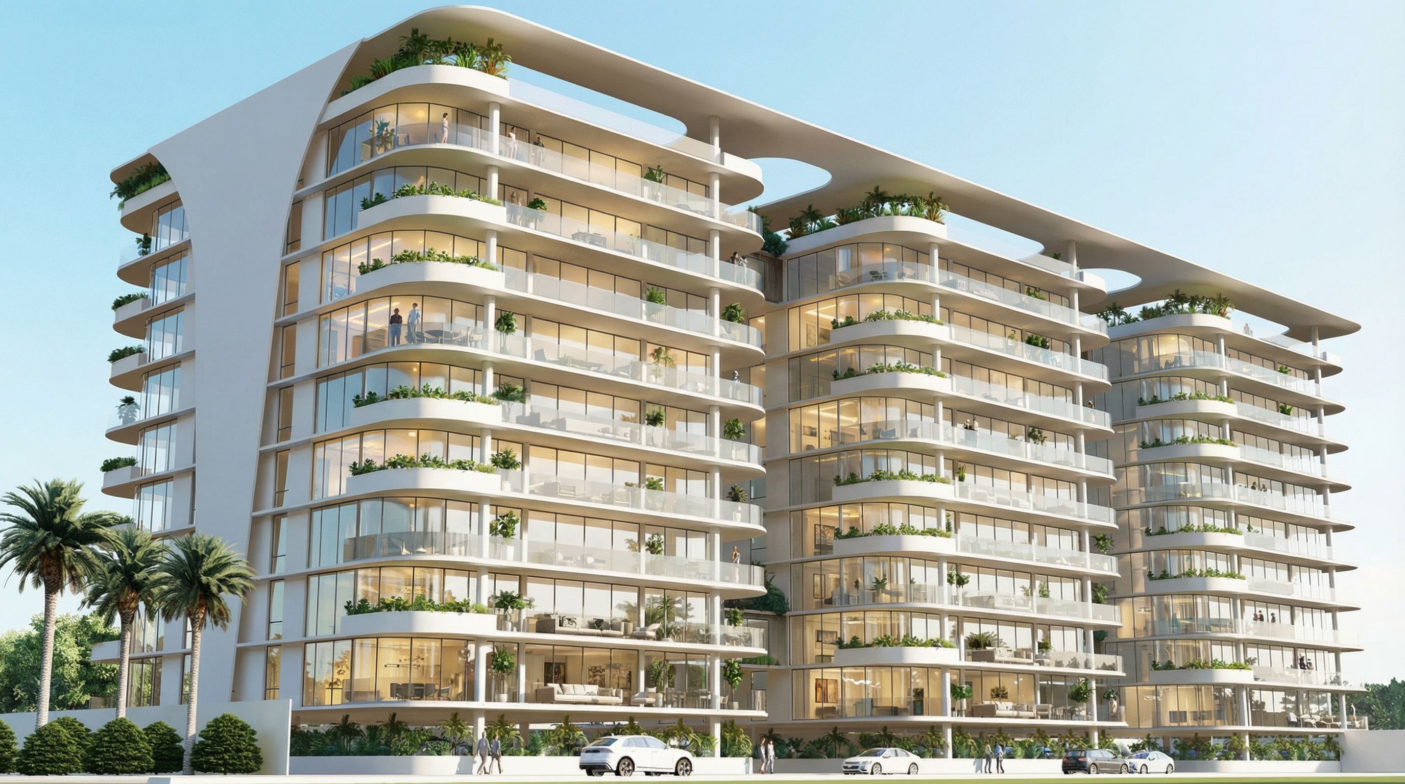 architectural exterior rendering, render this 3D mass into photorealistic rendering, Photo of a modern residential building featuring curved balconies and extensive glass facades, showcasing intricate architectural details with a focus on sleek materials and flowing lines. Surrounded by palm trees and lush landscaping, the setting emphasizes a contemporary urban context. Bright, natural daylight enhances reflections and highlights the building's elegance. Captured from a low angle with a wide lens to accentuate its height and grandeur, ensuring a dynamic composition. It has outdoor furniture and decorative plants on the balconies. The interior of the rooms is illuminated. It is a luxury building in white tones, beautiful., keep exact camera angle, including people, vehicles, greenery and vegetation, trees, high quality, professional, detailed scene