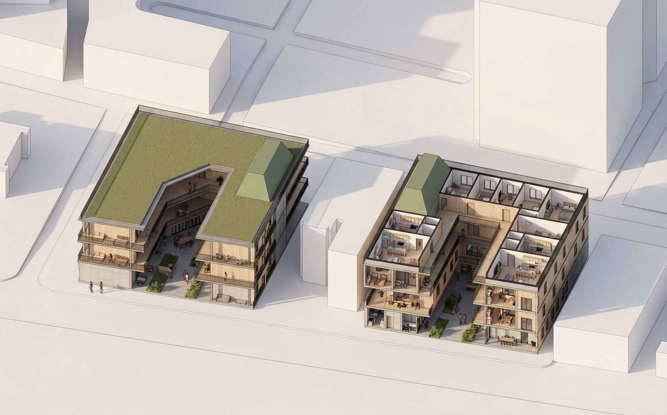 Promptinterior design rendering, render this 3D mass into artistic illustration, Render a high-resolution sectional aerial view of two three-story collective housing buildings, keeping the exact geometry, structure, and massing of the original model. Maintain a consistent minimal white context for the surrounding urban fabric to highlight the two primary buildings. The left parcel (corner parcel) should express a more public and social character — emphasizing openness, shared terraces, and circulation overlooking the courtyard. The right parcel (multi-family parcel) should appear more private and domestic, showing layers of apartments with visible furniture and family-oriented living spaces. Keep realistic materials: concrete base (Type I) for ground floors, light-toned wood or composite siding for upper floors, and dark metal railings and window frames. Represent the roof planes as planted or green roofs (muted green, not overly bright). Use warm daylight with soft shadows and natural sky tone to emphasize depth in the cut sections. Expose the interior layers—units, corridors, and courtyards—so they read clearly and convey lived-in space. Add very subtle human figures to suggest community use without distracting from the architectural clarity. The overall tone should stay consistent with your project render set: clean, calm, and professional, emphasizing tectonic clarity and spatial experience rather than artistic effects. The rendering should communicate both the architectural logic and the lived atmosphere of collective housing in Boyle Heights. keep the same elements don't add stairs, keep exact camera angle, high quality, professional, detailed scene
