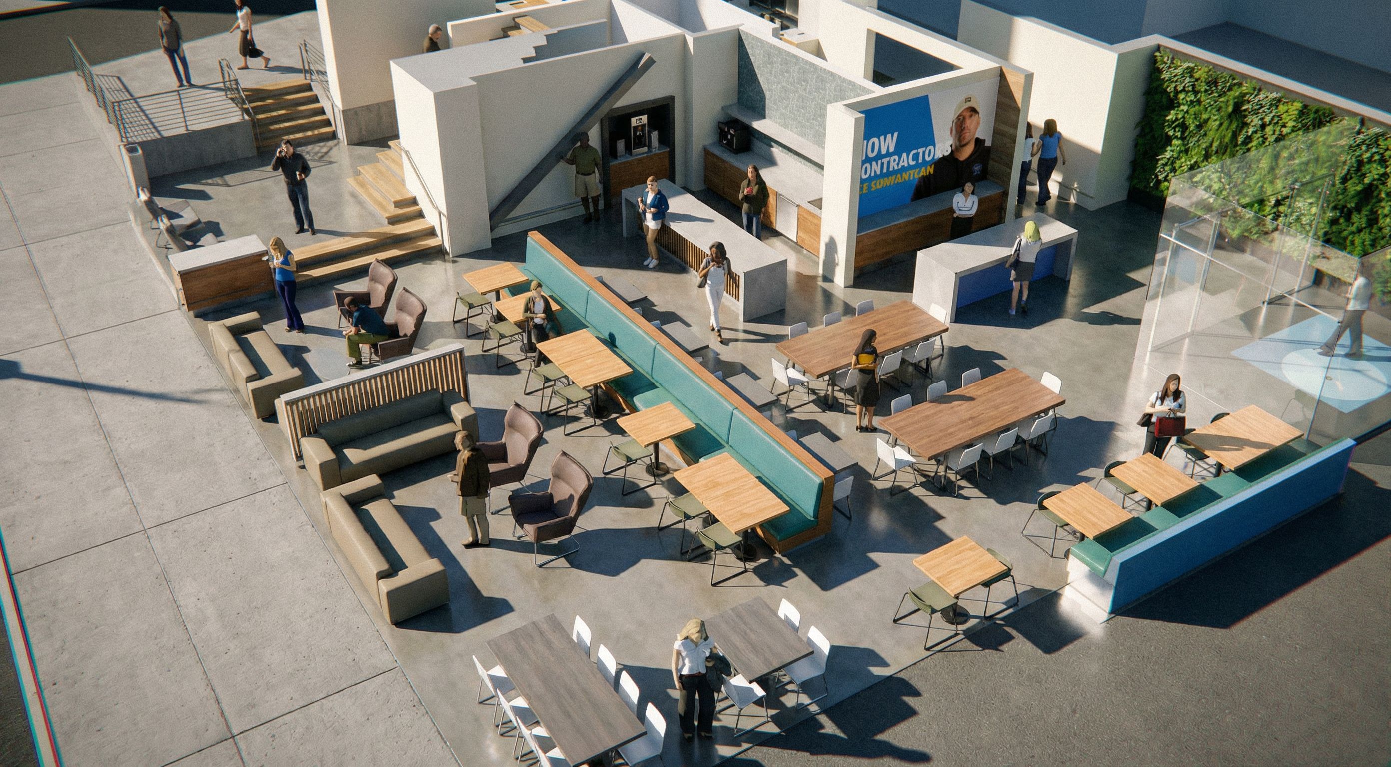 PromptPhoto of a modern coffee shop and cafe layout with collaborative spaces. Featuring sleek furniture with a mix of textures, soft seating areas, and a vibrant green wall, the design promotes interaction. Natural light floods the space, creating dynamic shadows. The camera is positioned from above, capturing the intricate arrangement of tables and chairs with a wide-angle lens to enhance depth perception. Additional elements include decorative screens and digital signage, showcasing the blend of functionality and aesthetic appeal in a contemporary urban environment. far left side of rendering in grey is a sidewalk not tables, keep exact camera angle. Glass vestibule on right hand side. Green plant wall NO windows, keep exact camera angle