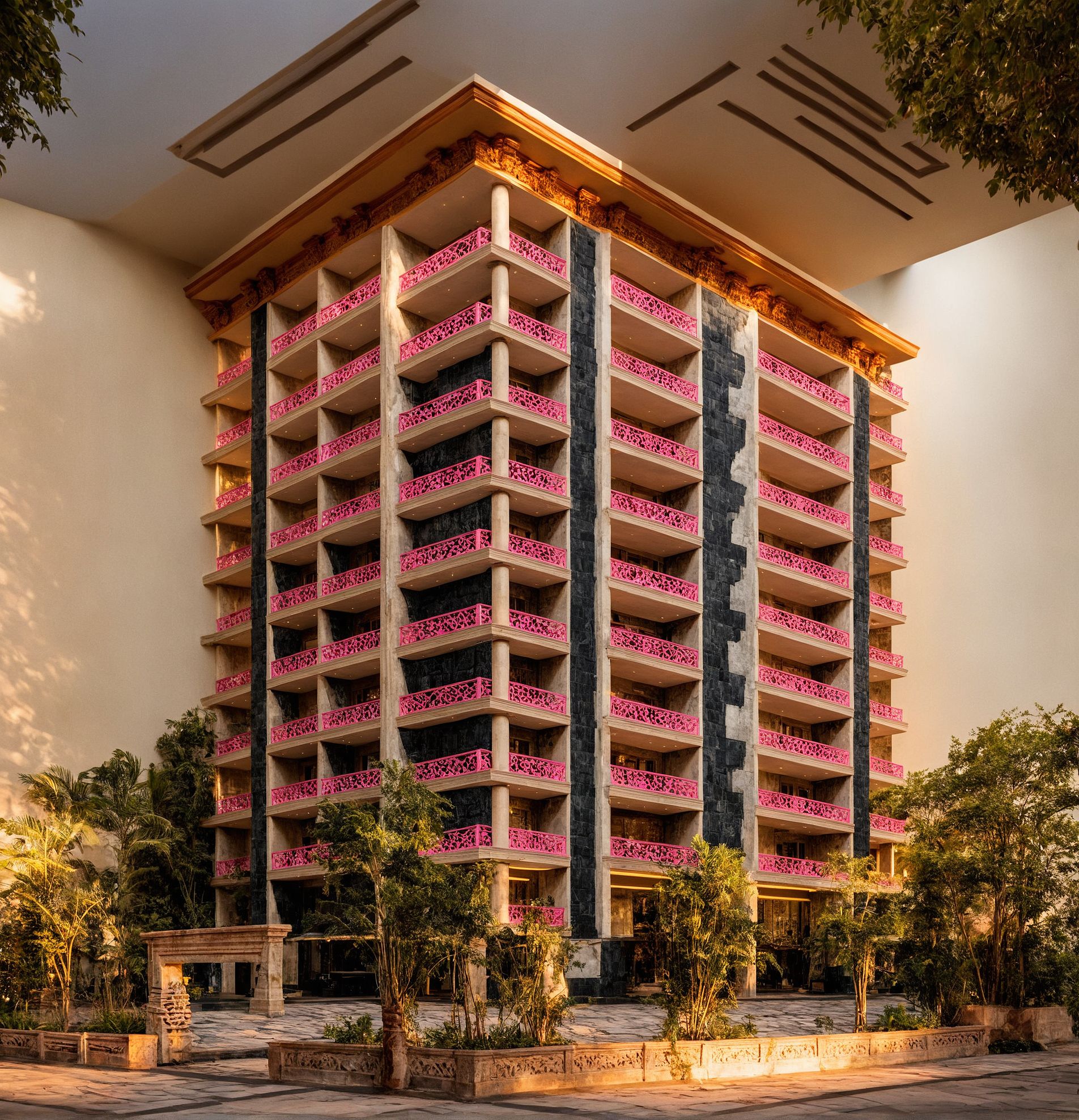 Promptgrand heritage apartment building, stone cladding,, classical arches and columns, royal Indo-European architecture, cinematic lighting, ultra-realistic with classical iron wrought balcony railings