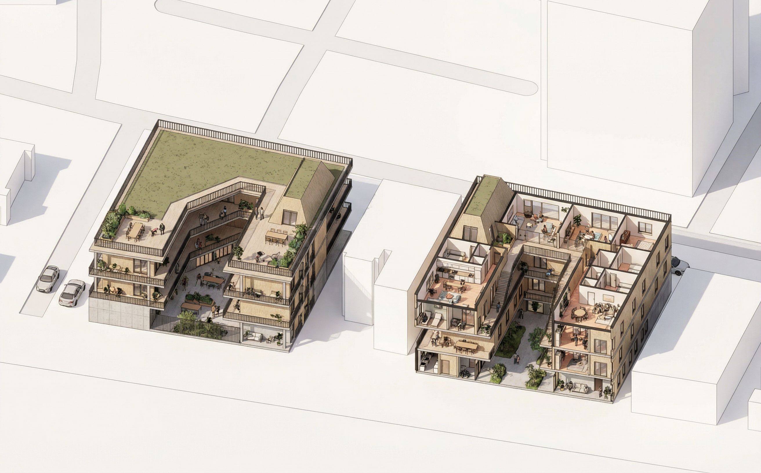 architectural exterior rendering, render this 3D mass into artistic illustration, Render a high-resolution sectional aerial view of two three-story collective housing buildings, keeping the exact geometry, structure, and massing of the original model. Maintain a consistent minimal white context for the surrounding urban fabric to highlight the two primary buildings. The left parcel corner parcel should express a more public and social character — emphasizing openness, shared terraces, and circulation overlooking the courtyard. The right parcel multi-family parcel should appear more private and domestic, showing layers of apartments with visible furniture and family-oriented living spaces. Keep realistic materials: concrete base Type I for ground floors, light-toned wood or composite siding for upper floors, and dark metal railings and window frames. Represent the roof planes as planted or green roofs muted green, not overly bright. Use warm daylight with soft shadows and natural sky tone to emphasize depth in the cut sections. Expose the interior layers—units, corridors, and courtyards—so they read clearly and convey lived-in space. Add very subtle human figures to suggest community use without distracting from the architectural clarity. The overall tone should stay consistent with your project render set: clean, calm, and professional, emphasizing tectonic clarity and spatial experience rather than artistic effects. The rendering should communicate both the architectural logic and the lived atmosphere of collective housing in Boyle Heights., keep exact camera angle, including people, vehicles, greenery and vegetation, trees, high quality, professional, detailed scene