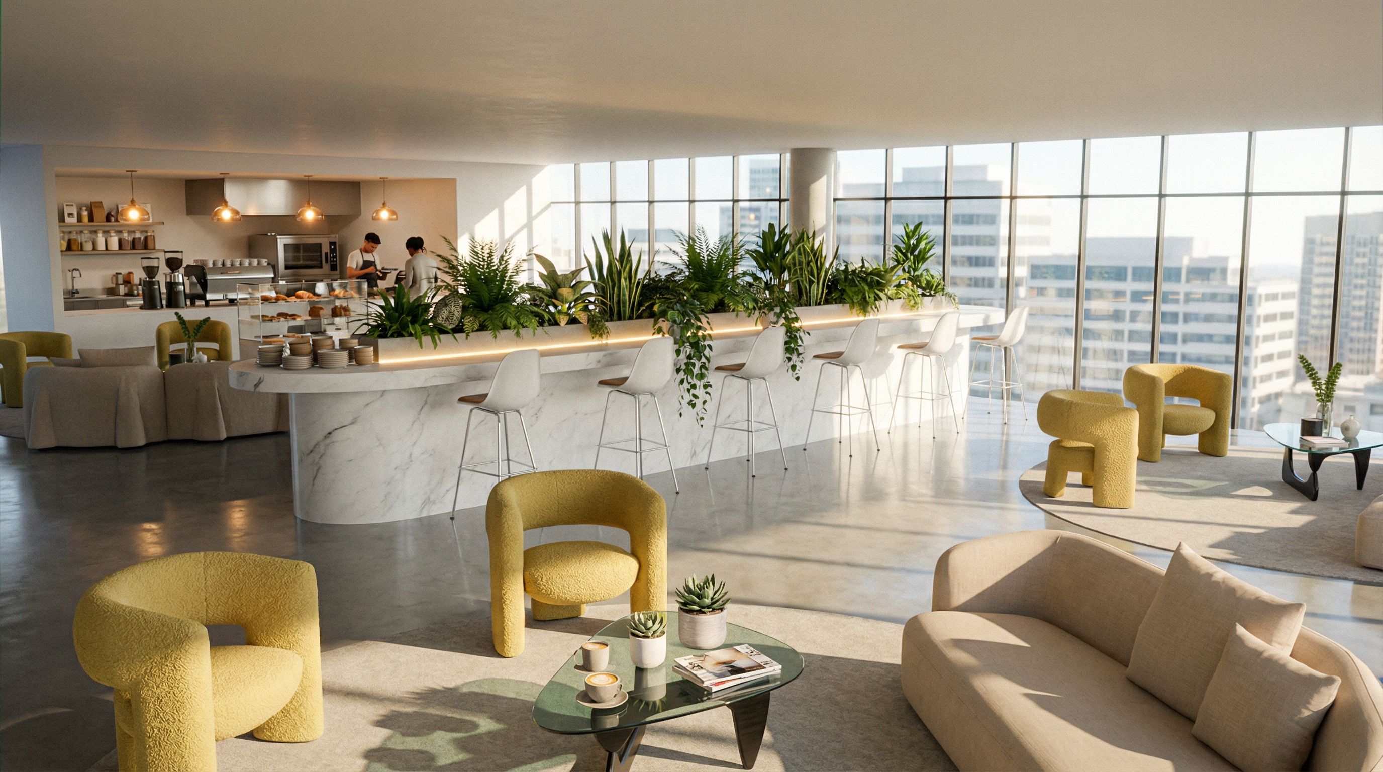 PromptThis is coffee shop inside office building i want to keep the model same just change materials, lighting and add some vegetations to make it modern realistic. The last part of the scene is the kitchen , keep exact camera angle