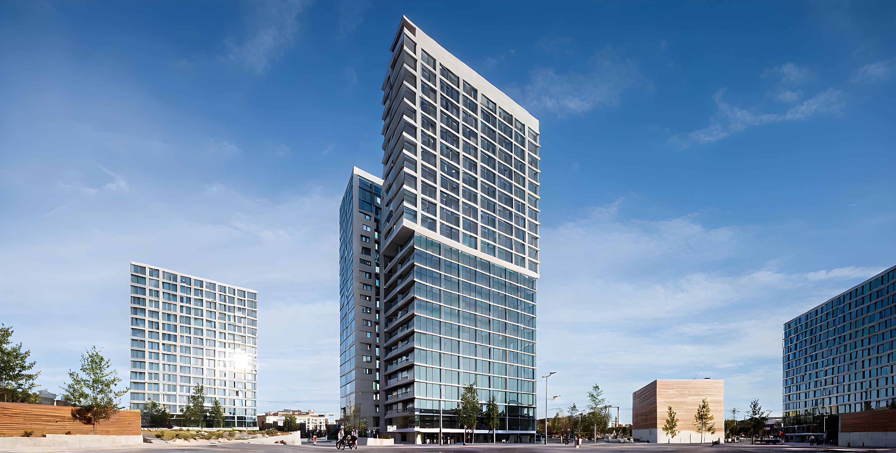 Prompt"Modern residential tower with a cantilevered design — lower part made of solid gray concrete with square grid windows (5 floors), upper structure narrower and offset, finished in white facade panels and wooden accents, featuring aligned balconies with glass railings. Scene includes active ground floor with cafes, outdoor seating, and pedestrians. Urban-natural setting with pine trees, shrubs, rocky foreground path, and modern background buildings. Daylight with clear skies, soft shadows, and a sense of vibrant public life. Include people walking, cycling, and sitting; realistic textures (glass, concrete, metal), and landscaping integration. Foreground stairs lead down to street-level plaza."