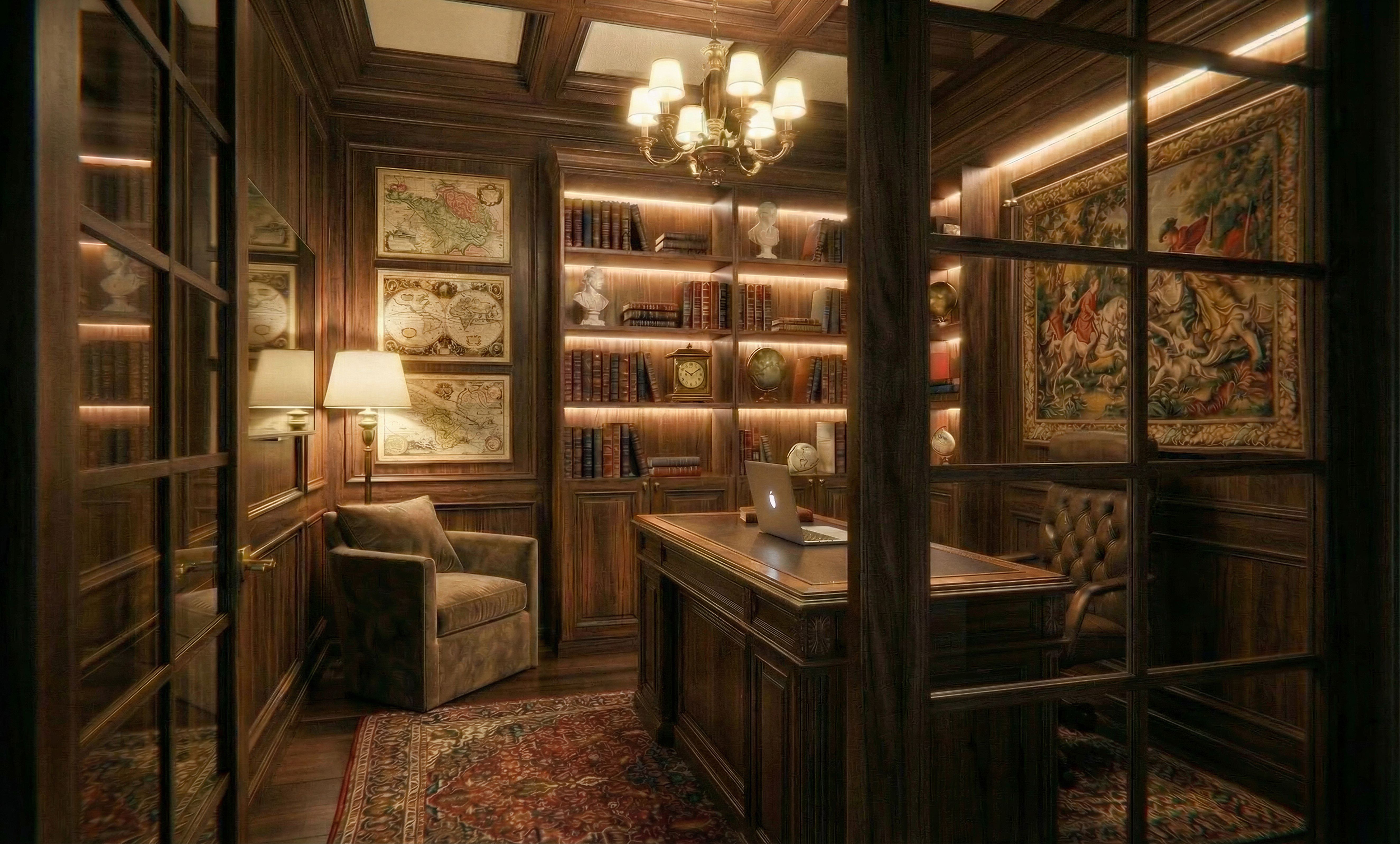 PromptReplace one globe on the shelf in the middle of back wall with an antique clock, keep the rest exactly the same, keep exact camera angle