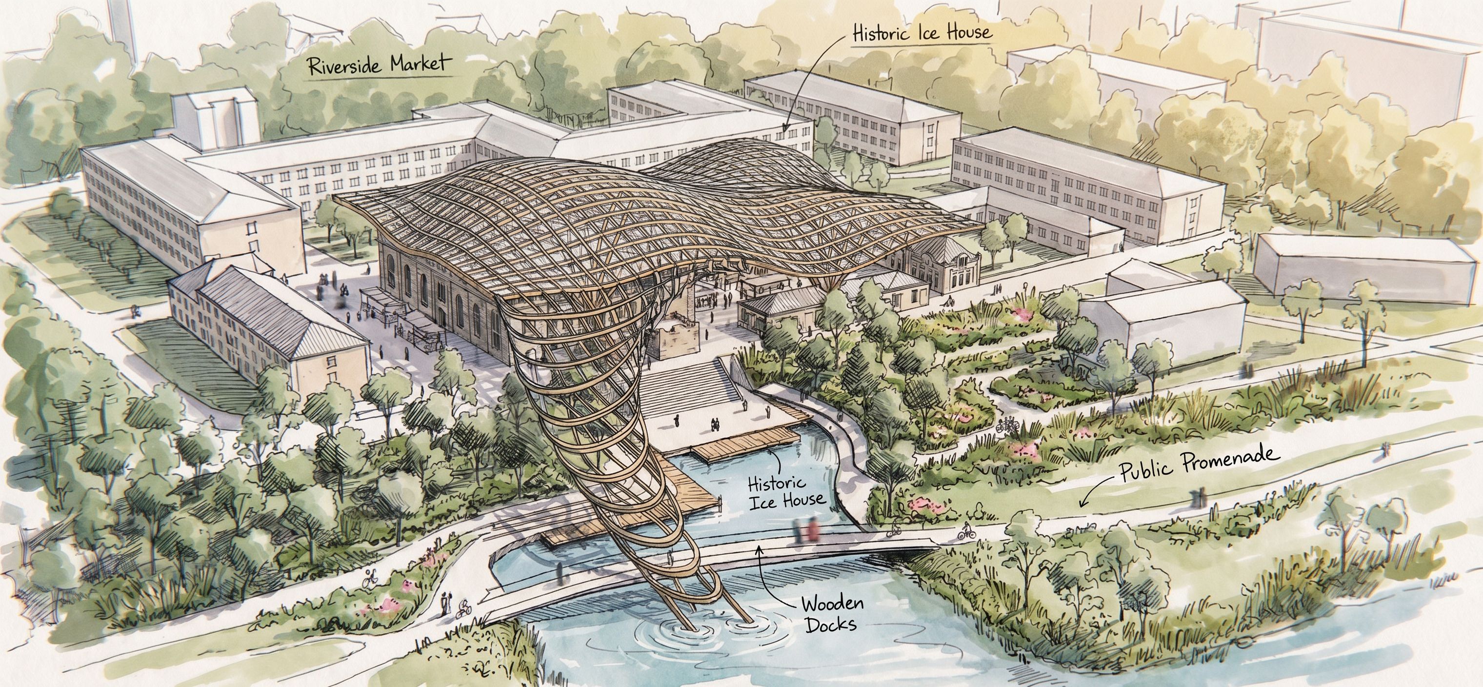 do this 3d model of my uploaded model but apply it to the scene in the reference photo so the roof will be just like in my uploaded model and the very tip in the front will be ending slowly in the water , keep exact camera angle