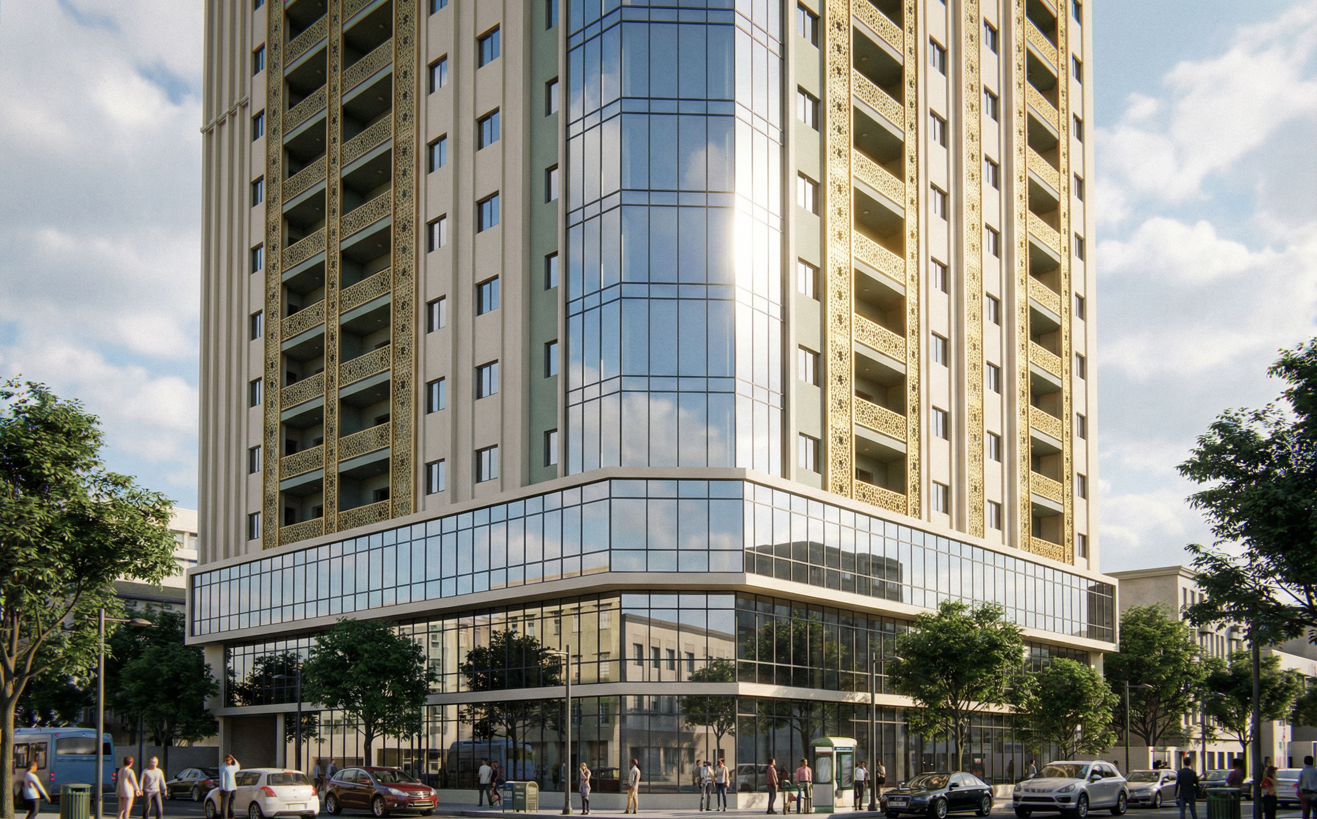 IMAGE OF A 20 STOREY BUILDING WITH GROUND FLOOR, FIRST FLOOR AND SECOND FLOOR AS COMMERCIAL AND 3RD-20TH FLOOR AS RESIDENTIAL. MAKE THE GLASS APPEAR REALISTIC, CLEAR AND REFLECTIVE. USE THE COMBINATION OF THE COLOURS IN REFERENCE IMAGE 1 ON THE BUILDING. USE THE MASHRAYBYA IN THE REFERENCE IMAGE 2 ON THE BALCONIES RUNNING FROM TOP TO BOTTOM. USE CURTAIN WALLING ON FIRST AND SECOND FLOOR AND THE CORNER BETWEEN THE TWO FACADES ., keep exact camera angle