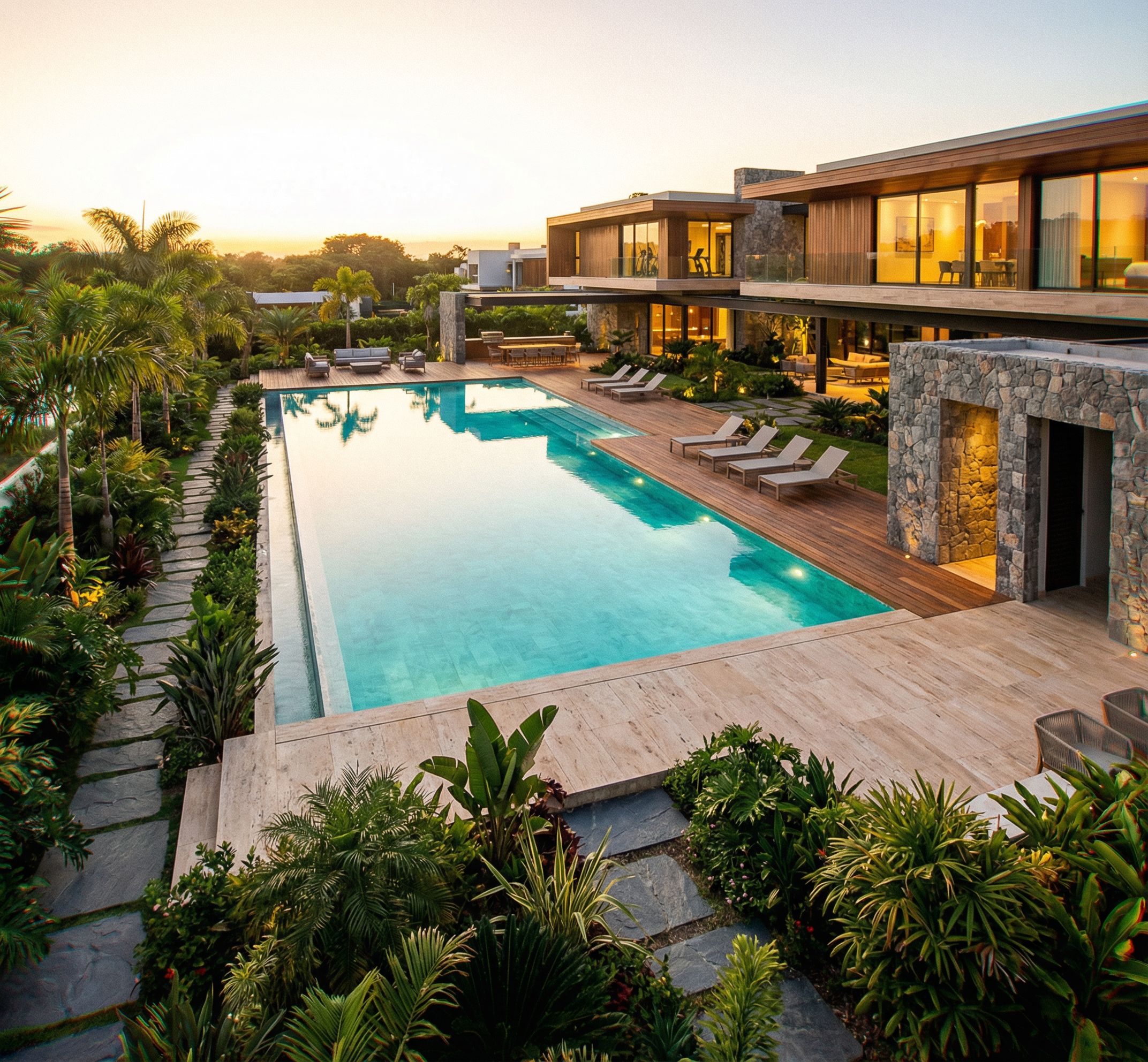 "High-end luxury outdoor swimming pool and lush garden, modern architecture integration, infinity pool with turquoise crystal clear water, premium wooden deck, slate stone pathways, tropical landscaping with palm trees and architectural plants, professional exterior photography, cinematic lighting, 8k resolution, photorealistic, architectural visualization, sunset golden hour glow." respeta las distribuciones del planol original