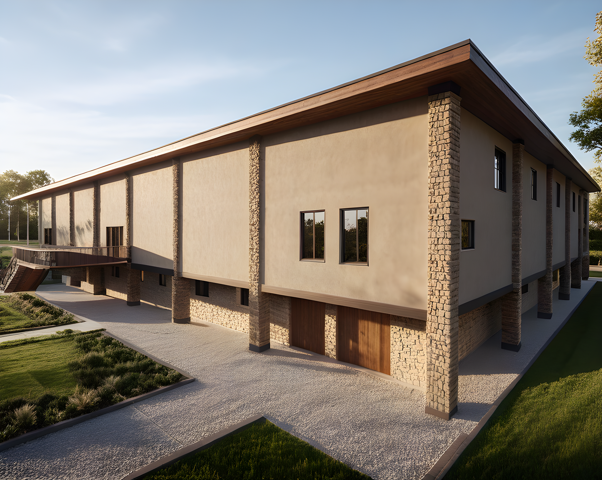 PromptBrown Stucco building with ashlar stone columns and a thin wooden roof. The first floor is offset inward about 8ft from the columns. There is grass in the front yard. The sun is shining from the upper left side of the building