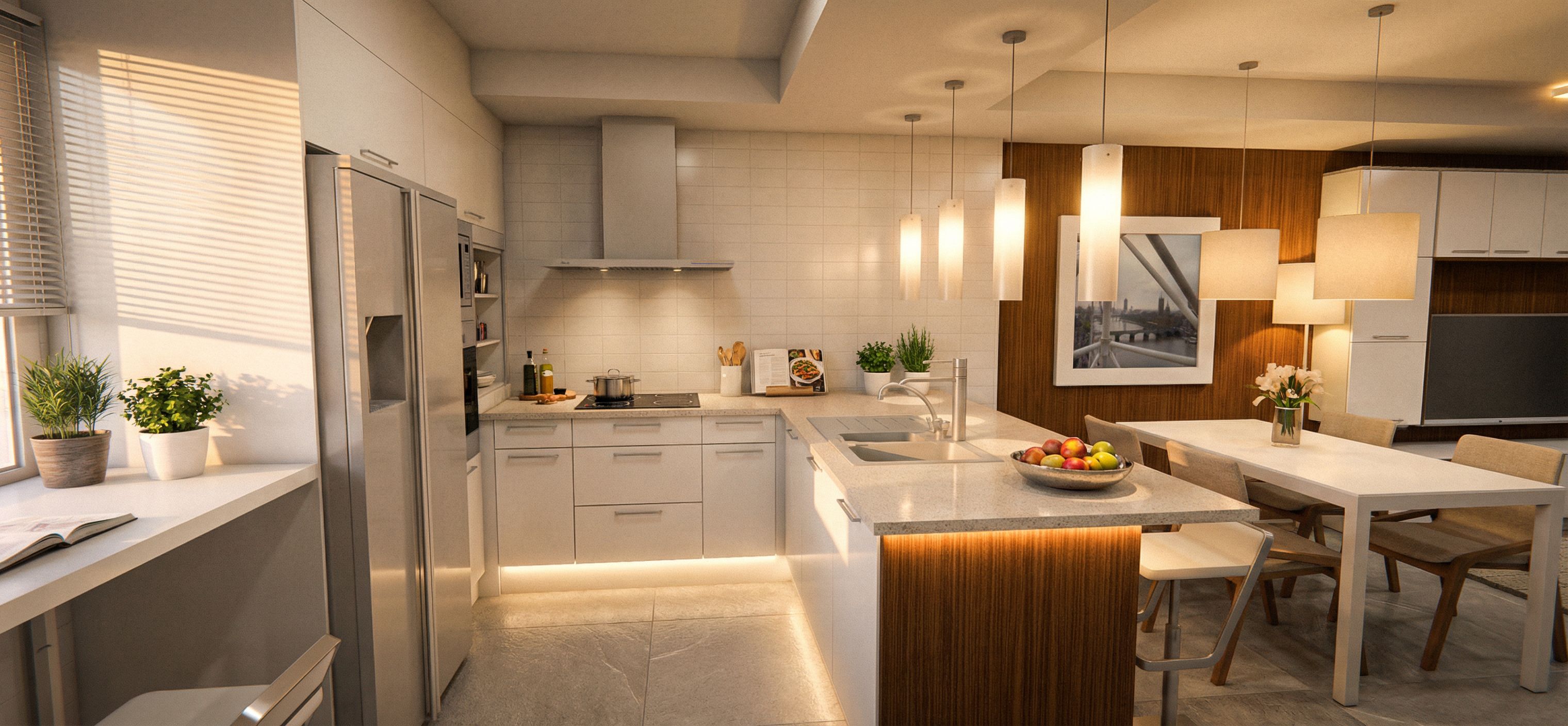Prompt- sustituir el blanco brillo por el blanco mate delos muebles. - Añade un pavimento de gran formato tipo 90x60 centímetros de color gris perla con textura tipo volcánico acabado mate. - Añade luz lineal bajo la barra de la cocina. - Sustituye las sillas de la mesa por un modelo nordico con una con una tela beige., keep exact camera angle